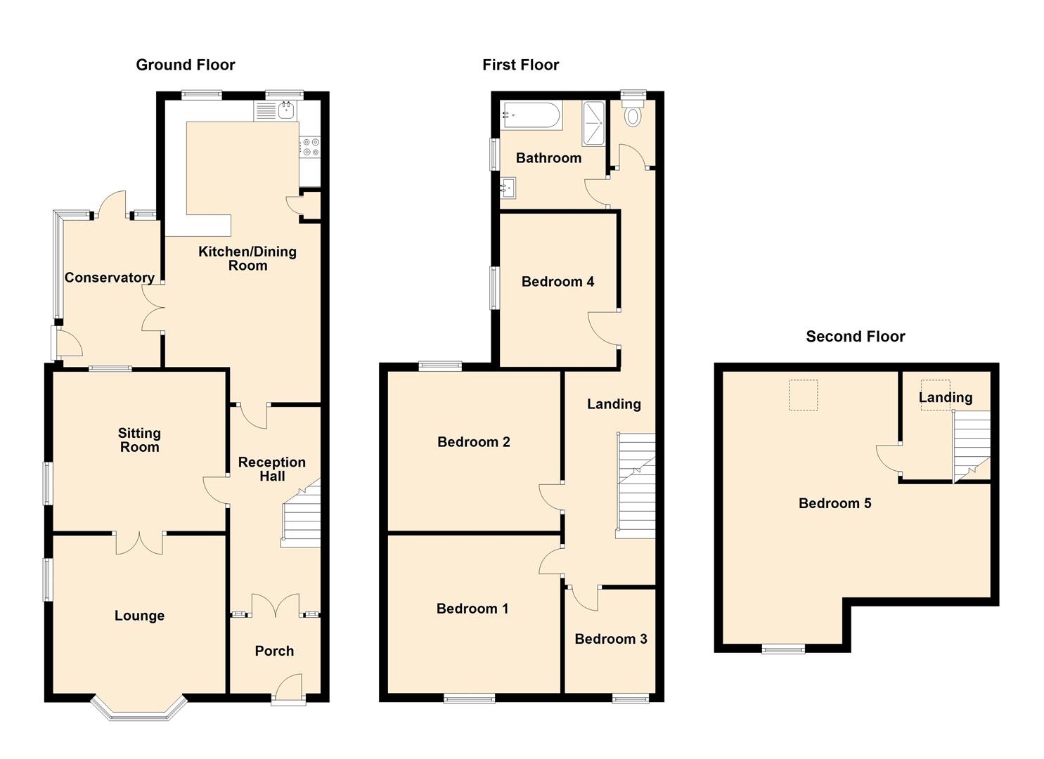 The first and second floors host five bedrooms, along with a well-appointed family bathroom. The top floor enjoys a particularly charming aspect with exposed beams, feature brickwork, and breathtaking views. uPVC double glazing and gas central heating.