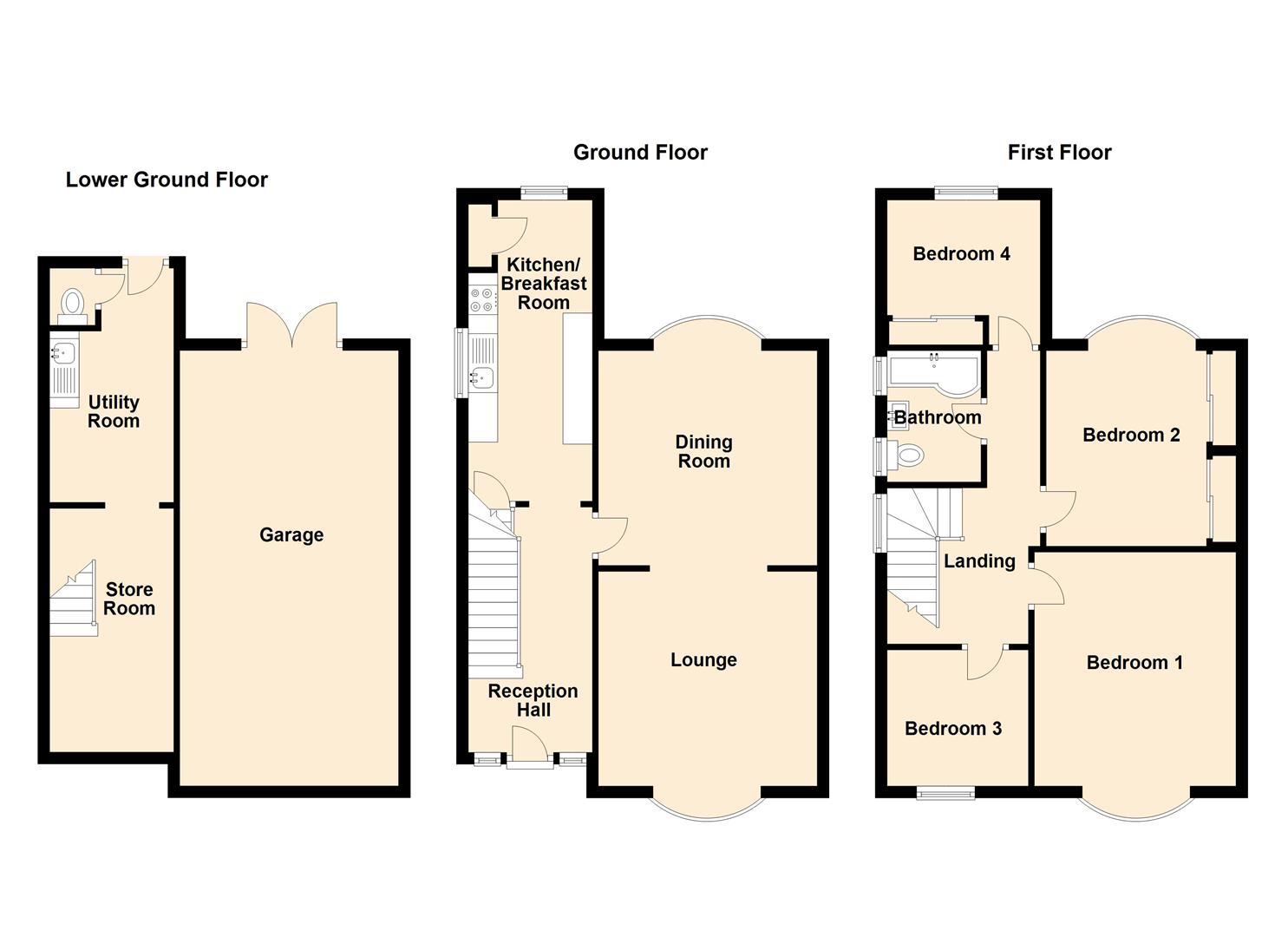 Fitted range of base and wall units, single drainer sink, gas and electric cooker points, plumbing for dishwasher, canopy stainless steel extractor hood, uPVC double glazed side and rear windows enjoying views, built in larder cupboard with shelving, wall tiling, inset spotlighting. Door from Kitchen leads down to lower ground floor utility area.