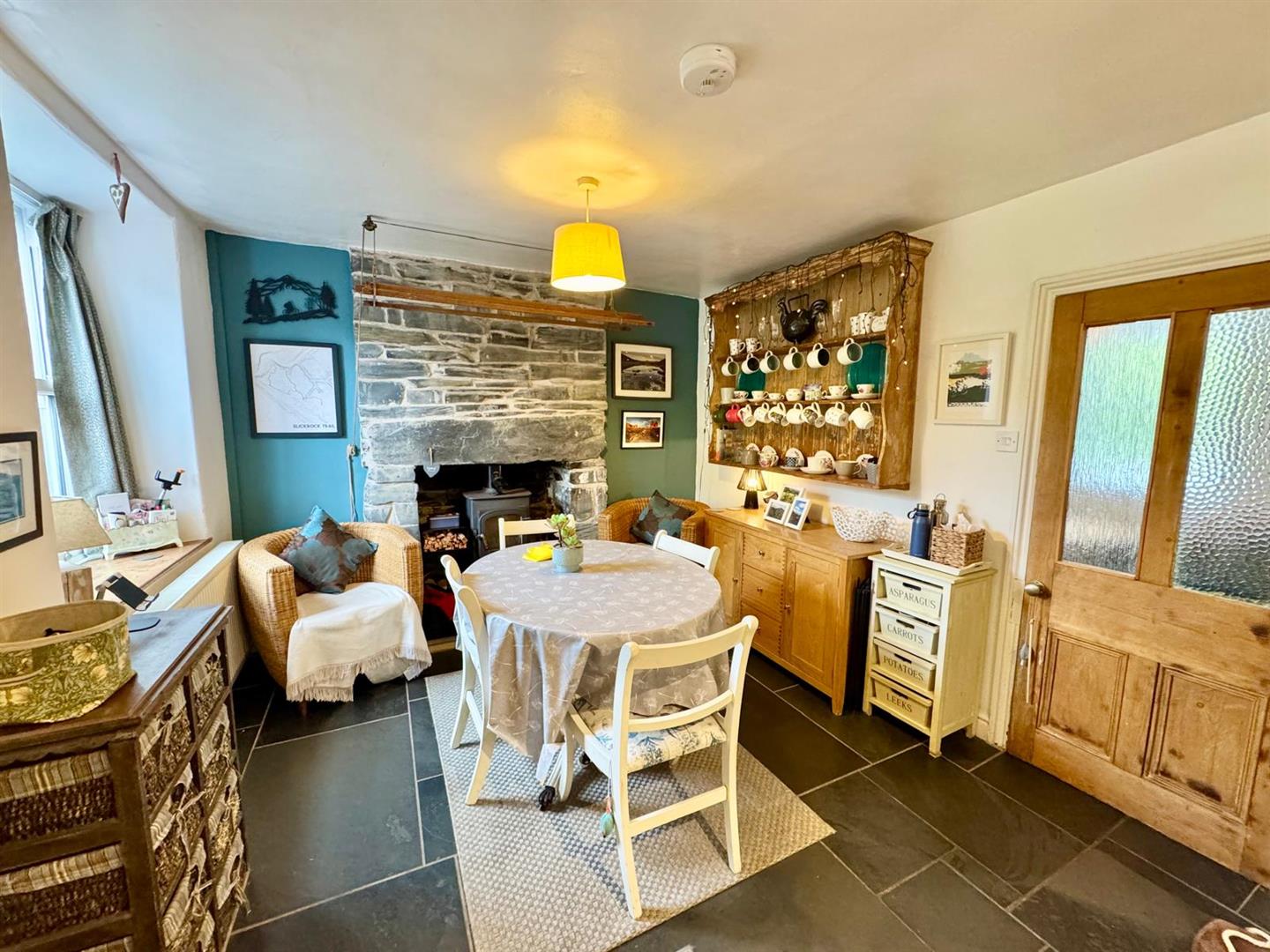 Slate tiled floor. Small recessed fireplace housing multi-fuel burner. Radiator. Feature plate shelf. Telephone point. Window overlooking the front garden to the mountains beyond. Door through to: