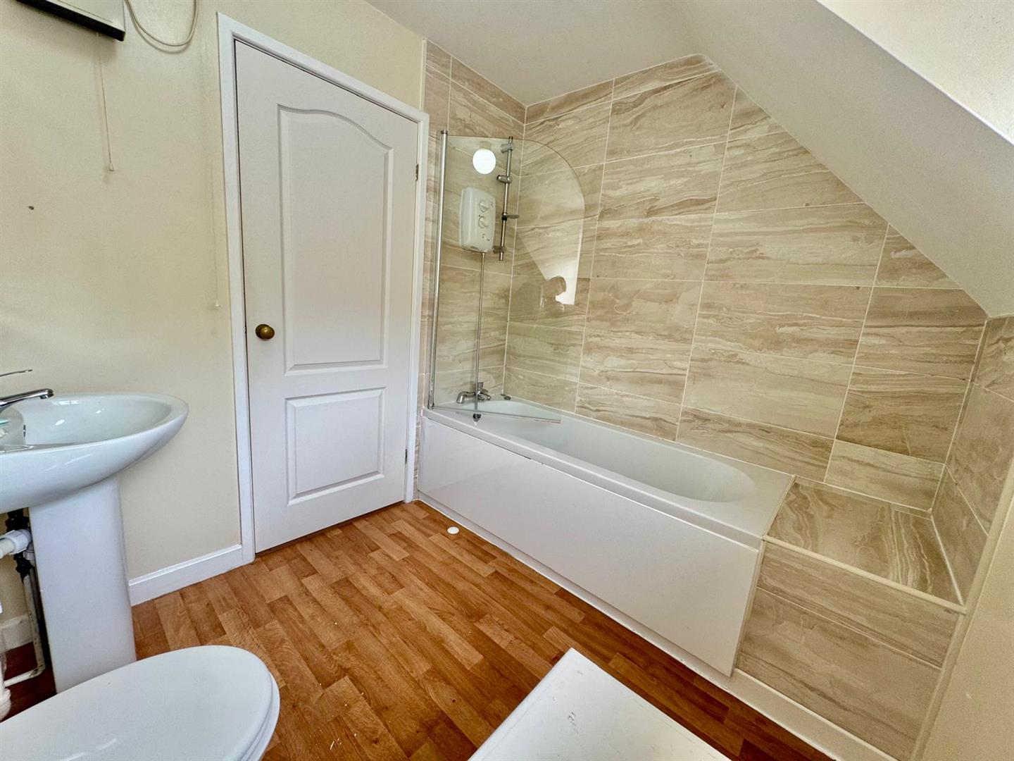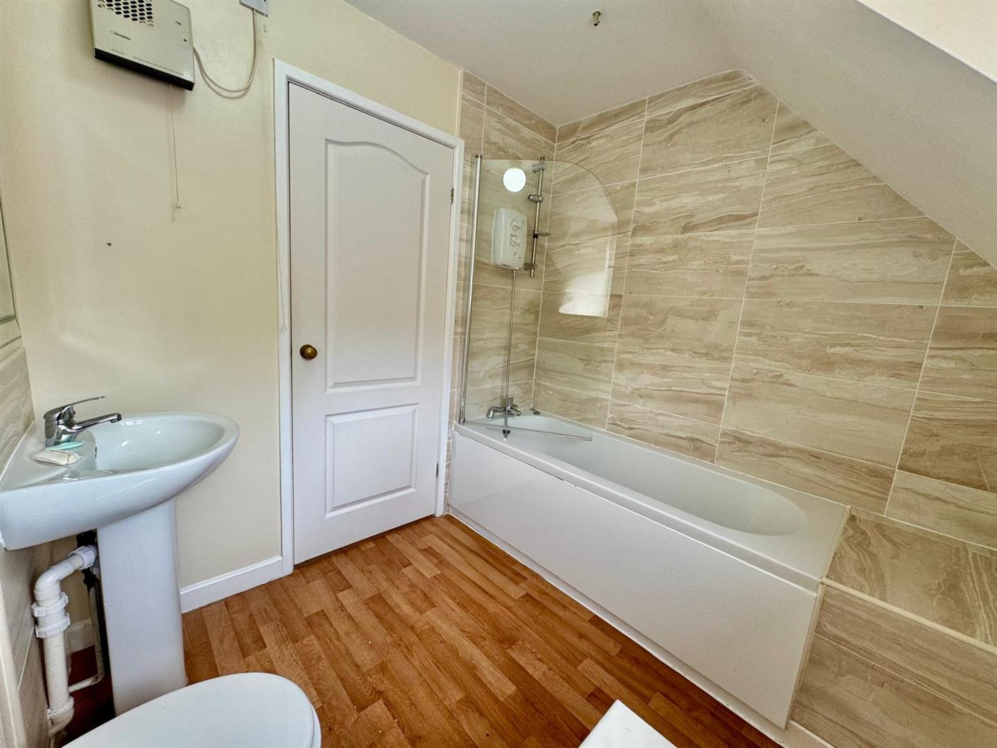 Panelled bath with electric shower above, shower screen, pedestal wash handbasin, low level w.c. storage plinth, uPVC double glazed window overlooking front, wall mounted light and shaver point, mirror, fan heater.