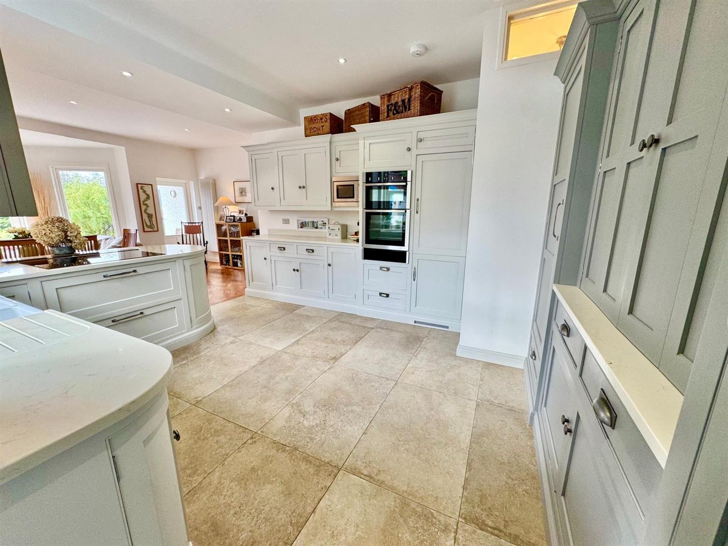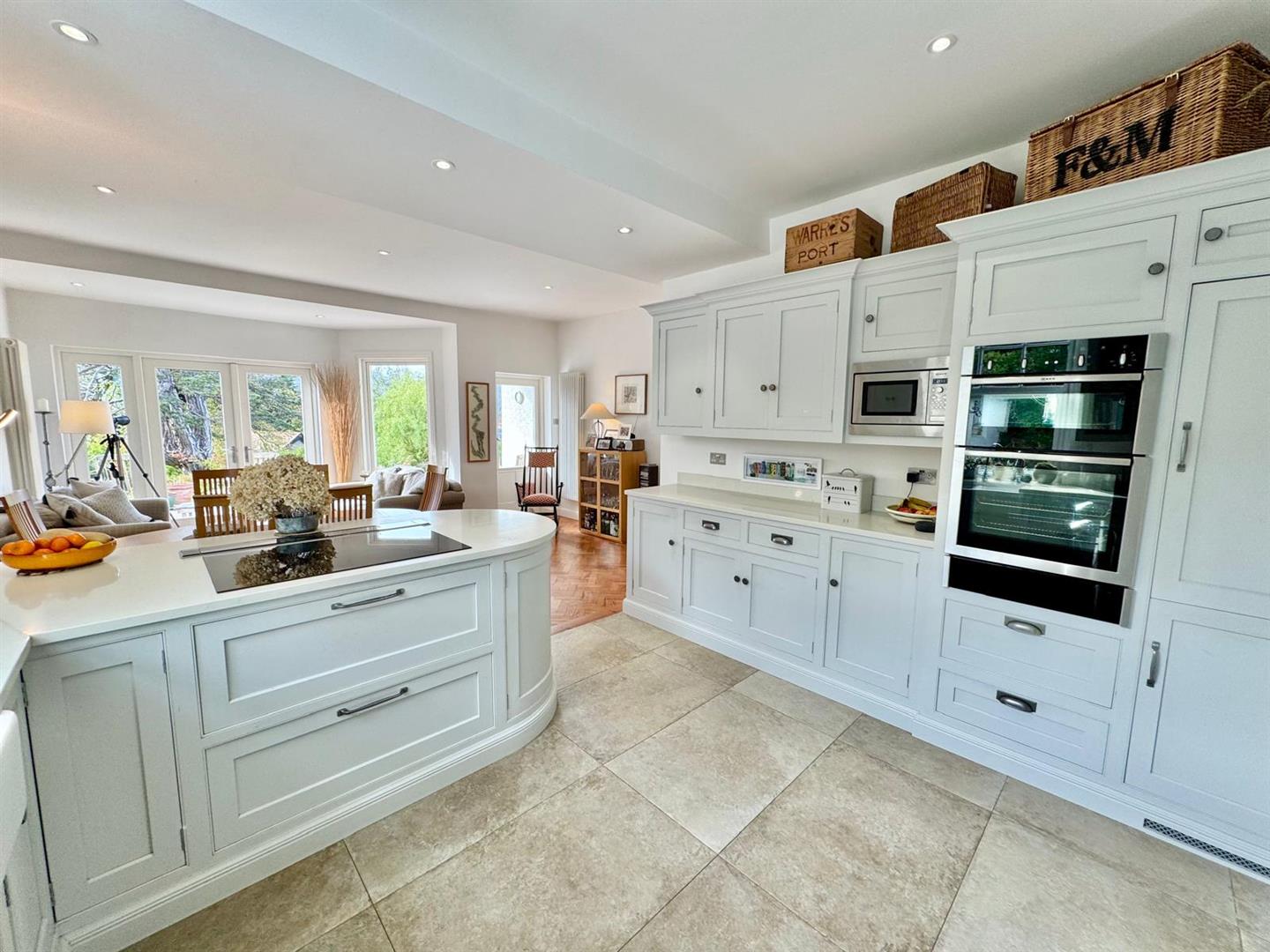 Sitting/Dining Area: With parquet timber flooring; column radiator; inset lighting; French doors leading onto rear sun terrace; window overlooking rear; Peninsula base units and breakfast bar subdividing from large kitchen with bespoke fully fitted handmade base and wall units with corian worktops; corian breakfast; integrated neff appliances including; split level double oven and grill with integrated warming drawer; integrated microwave; large ceramic induction hob with concealed automatic venting system; 2 bowl porcelain 'Belfast' style sink with Quooker tap; moulded splashback; integrated dishwasher; integrated fridge. Bespoke pantry cupboard.