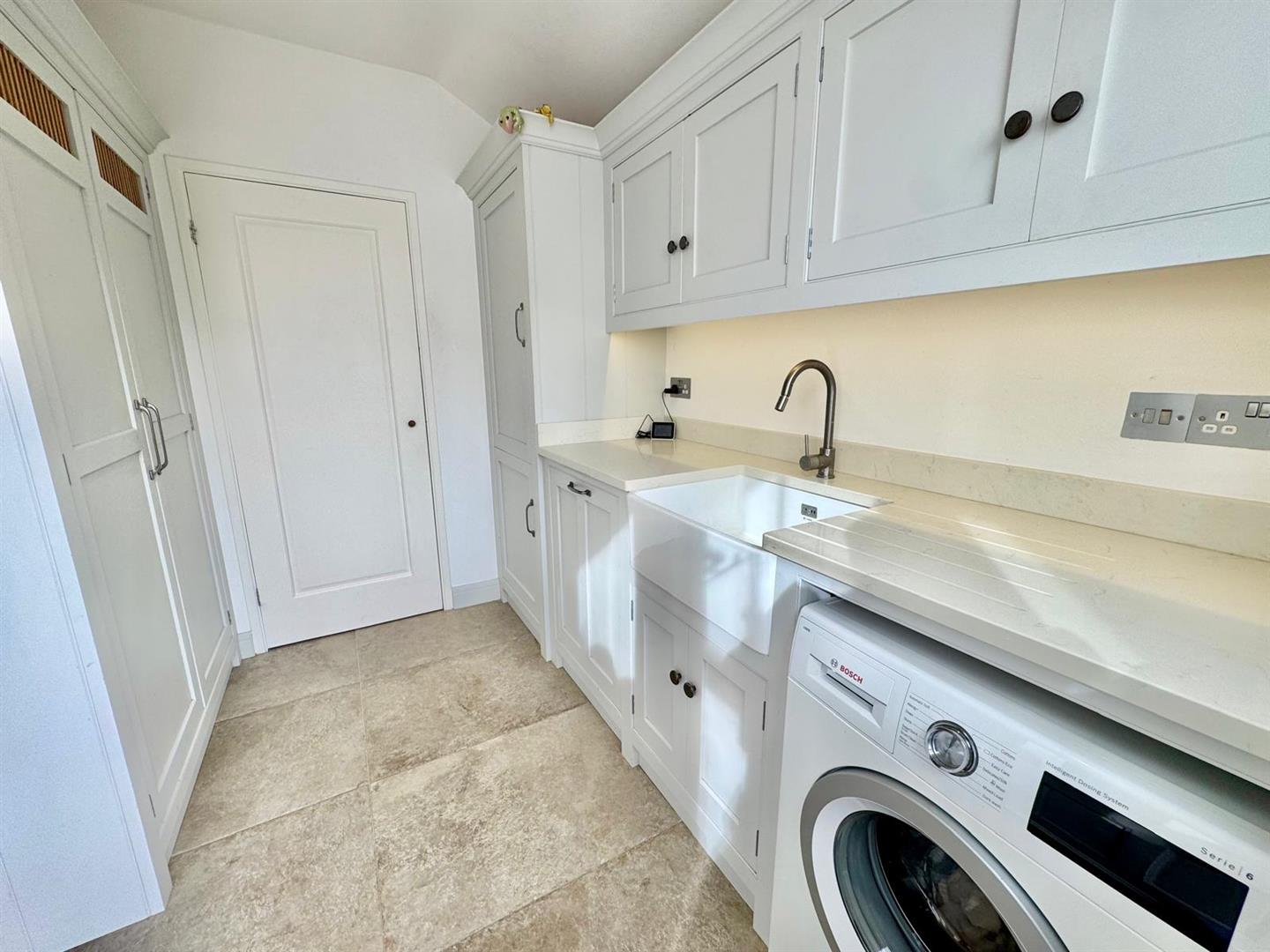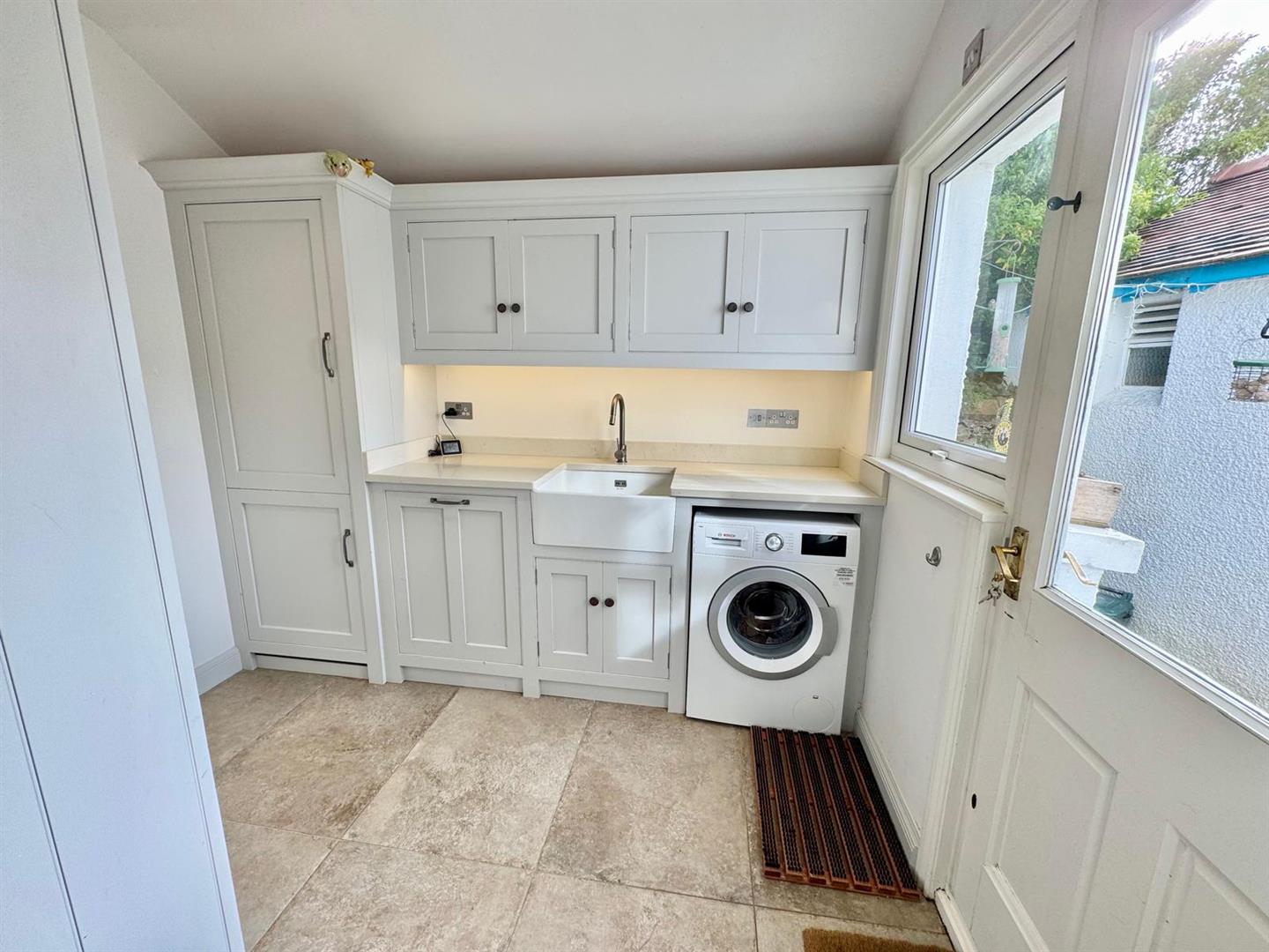 Bespoke fitted base and wall units with corian worktop; plumbing for automatic washing machine; inselt 'Belfast' style sink; pull out waste and recycling drawer; integrated fridge freezer and large bespoke cloak and storage cupboard. Rear double glazed door and window leading onto Courtyard area; walk-in cylinder and boiler room with wall mounted Vailliant central heating boiler; built in wall cupboards; large water cylinder tank.