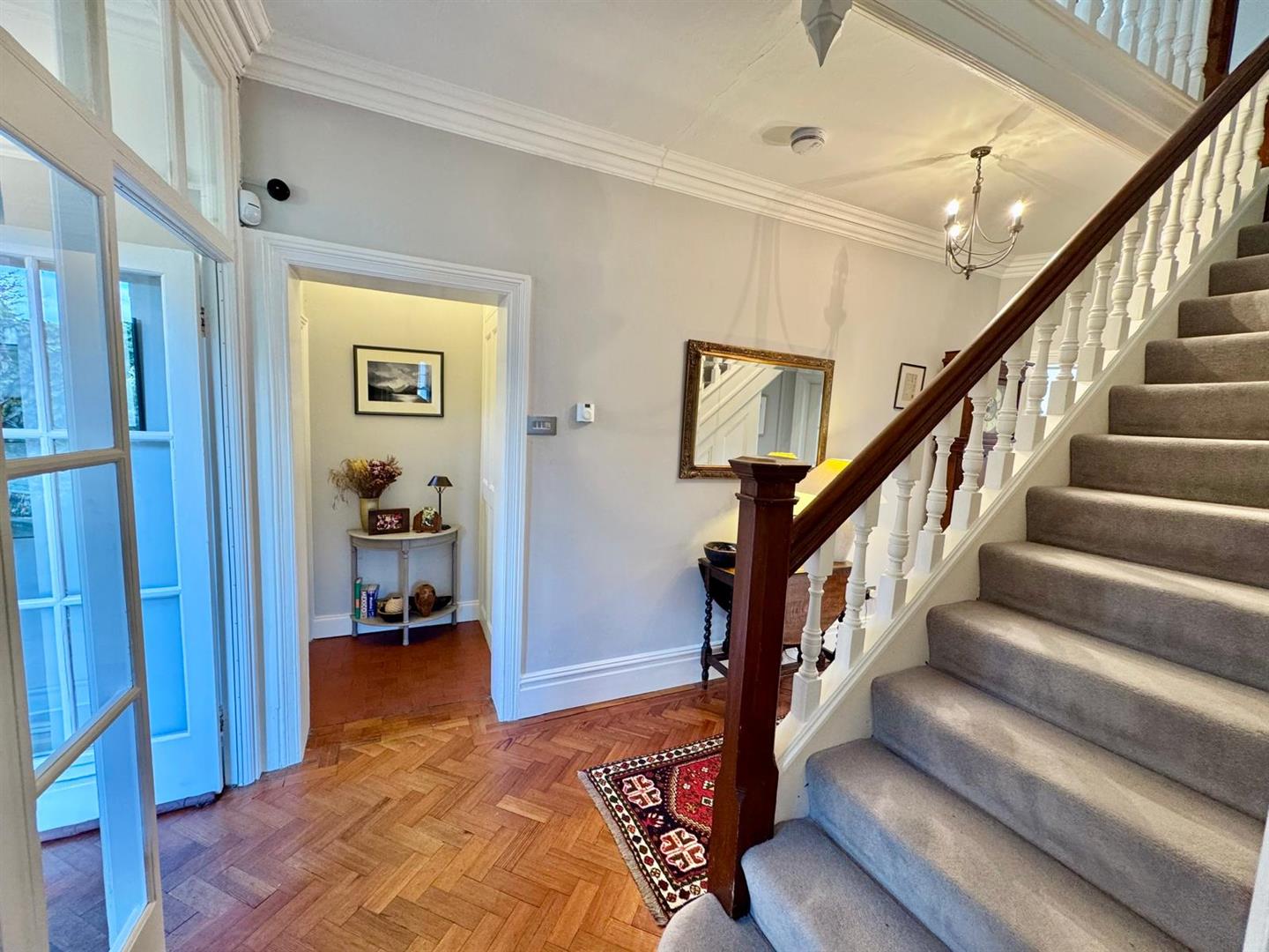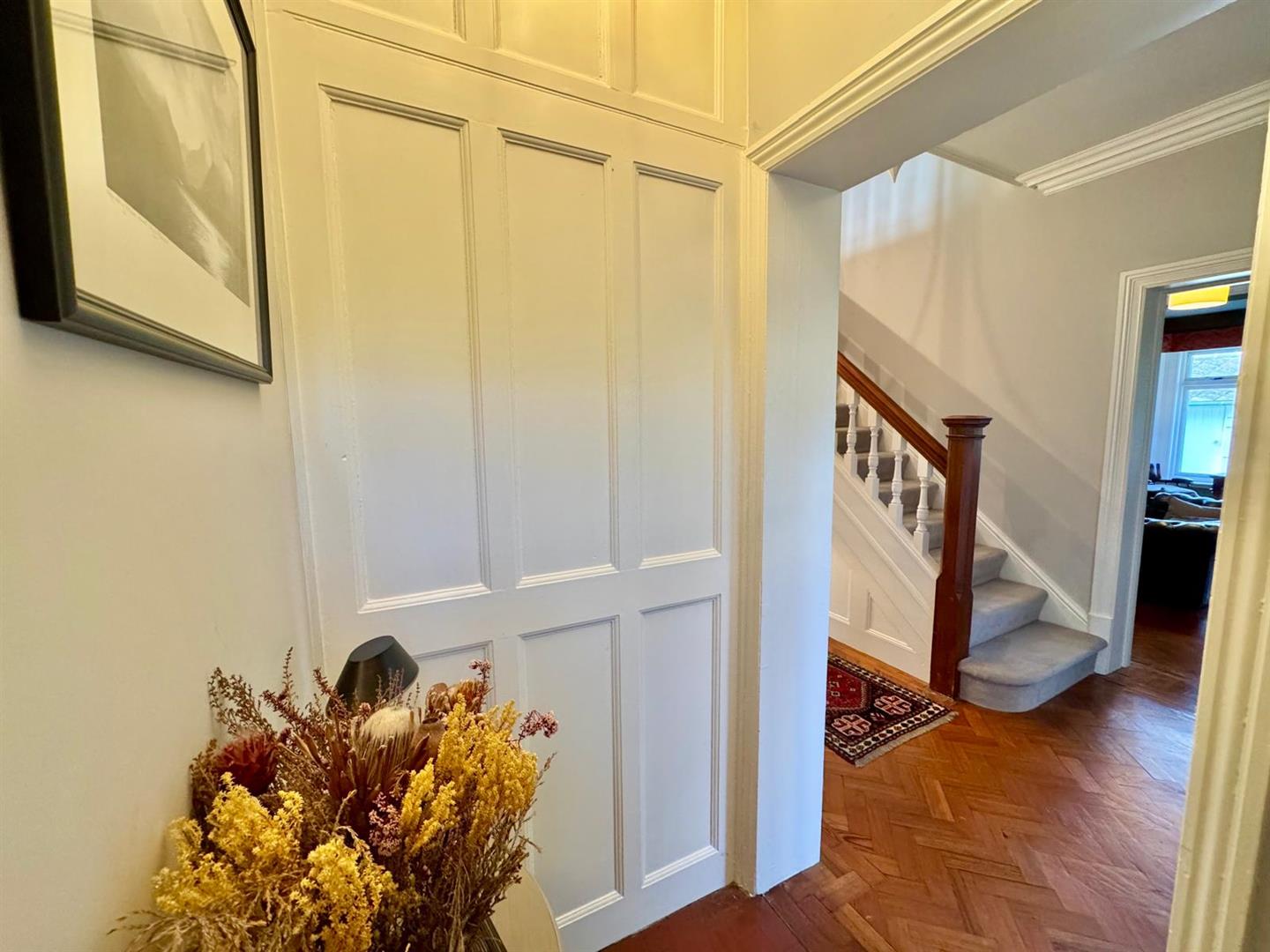 Feature balustrade and spindle staircase leading off to first floor level; herringbone parquet flooring; radiator; understairs storage cupboard. Access leading to: