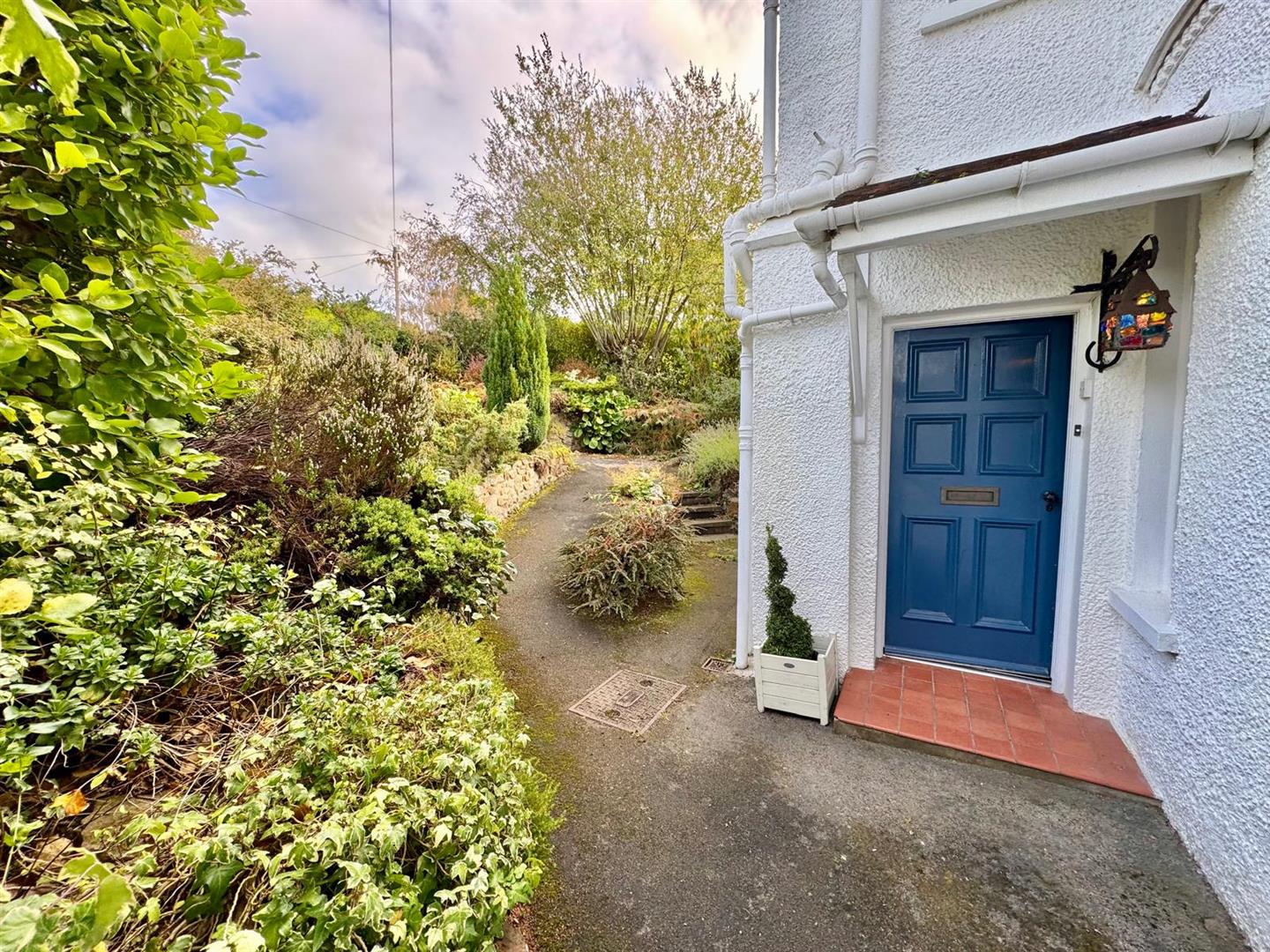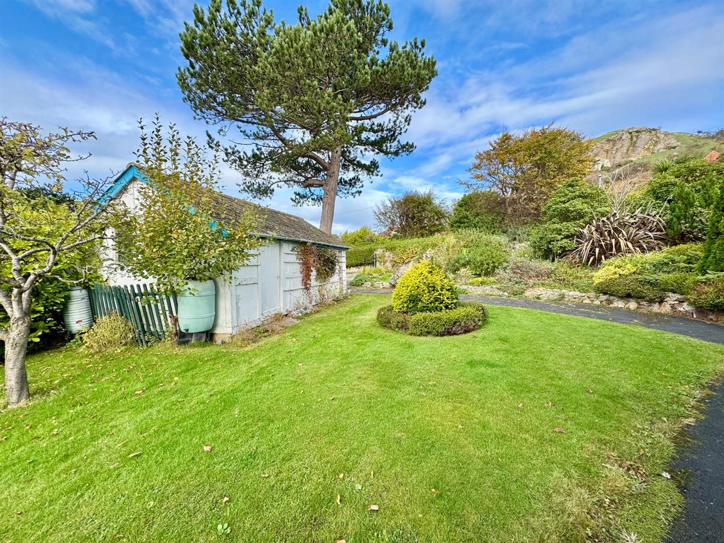 The property is approached via a gated path with well-maintained gardens to front and rear, featuring a variety of mature planting, lawns, and stone boundary walls. A detached garage provides useful storage and off-road parking.