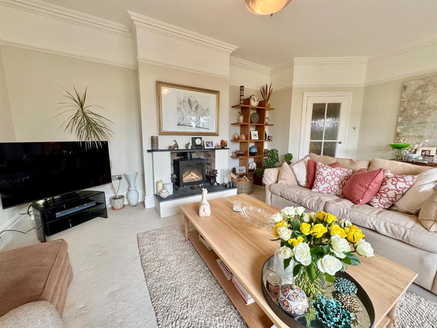 Coloumn radiators; feature recessed fireplace with raised hearth housing log burning stove; t.v point; large double glazed windows overlooking rear and side elevation; French door leading onto rear sun terrace enjoying views; coving; picture rail.