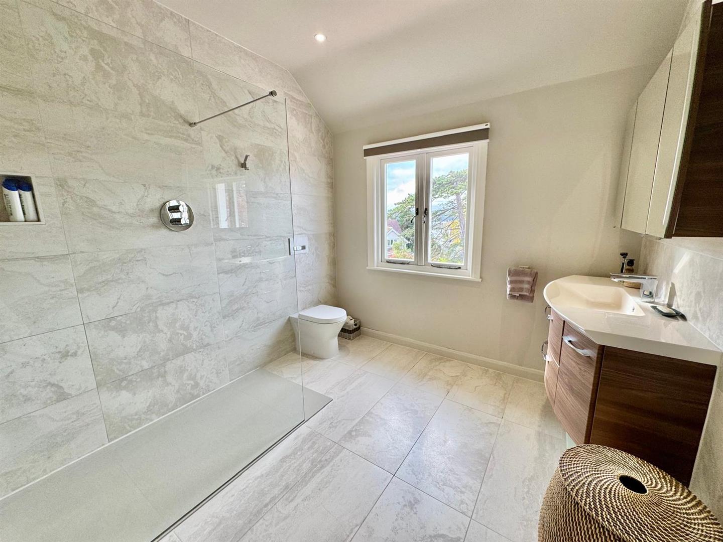 Large walk in shower with glazed screen and raindrop style shower above; concealed cistern w.c and vanity wash basin with medicine cabinet and mirror above; wall tiling; inset spot lighting and extractor fan.