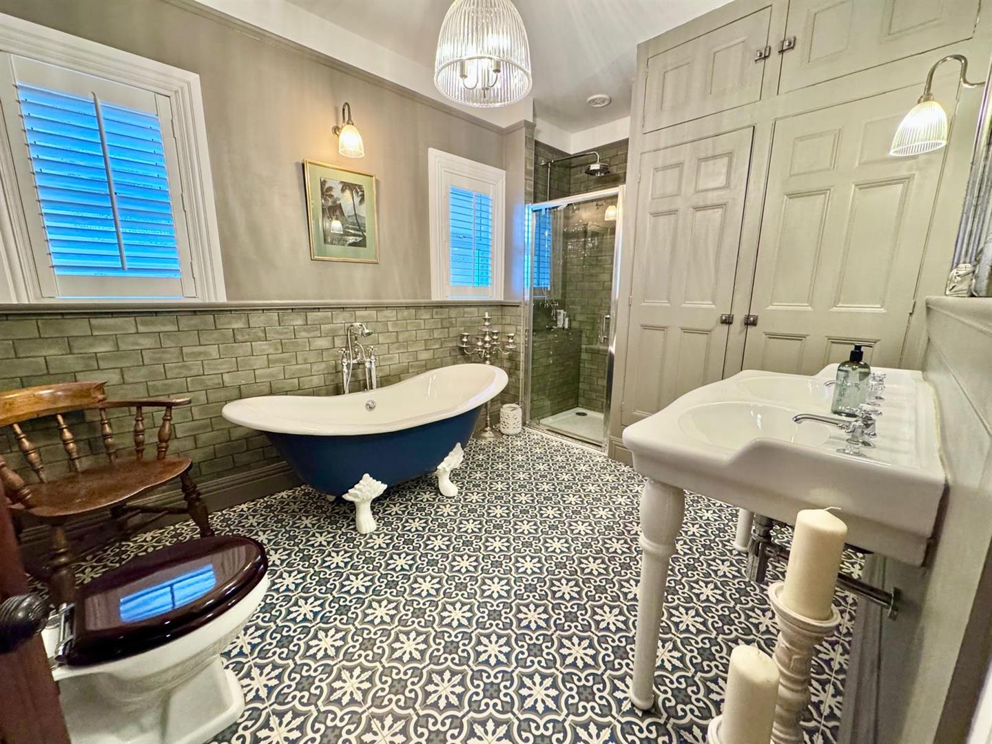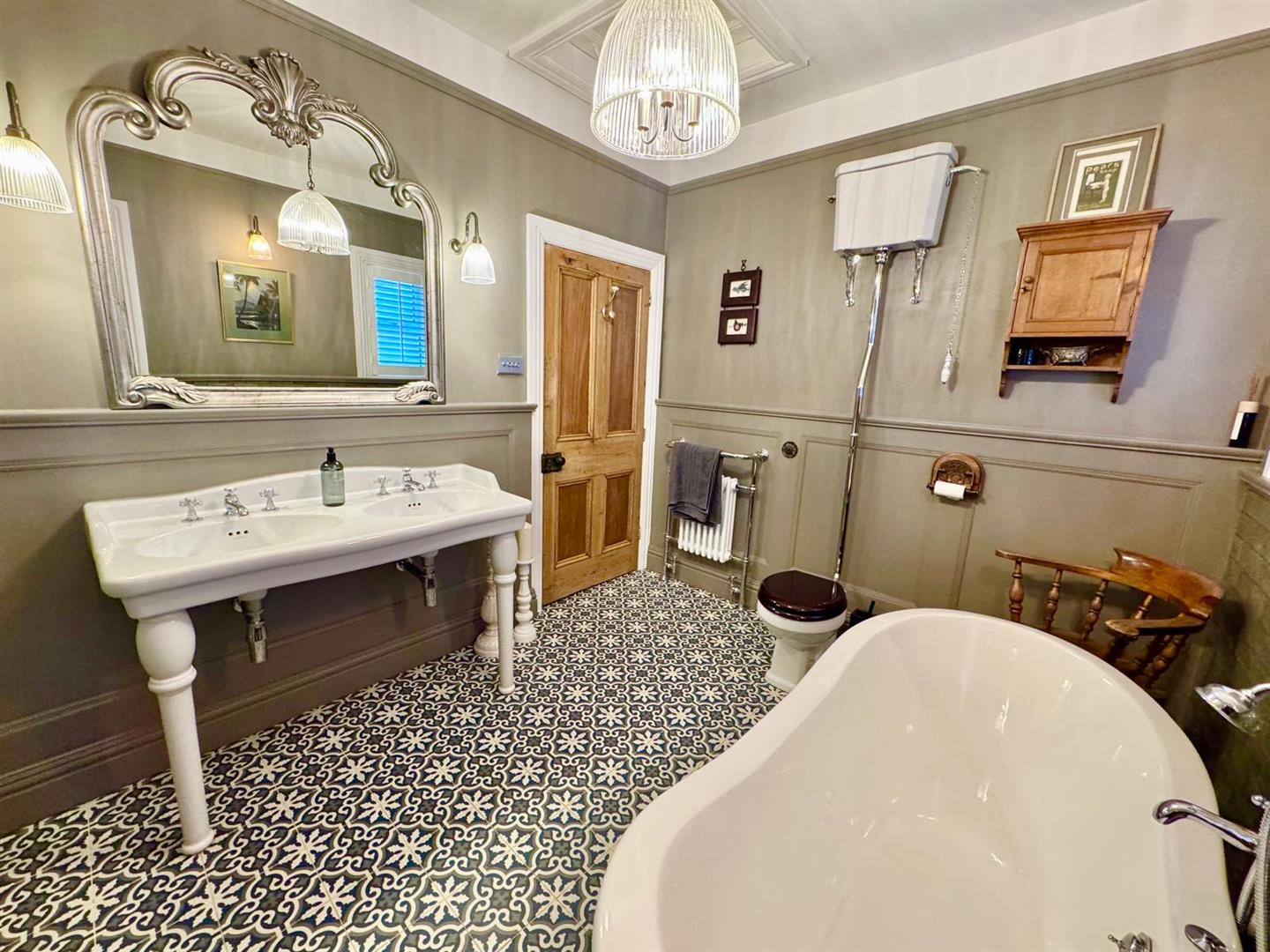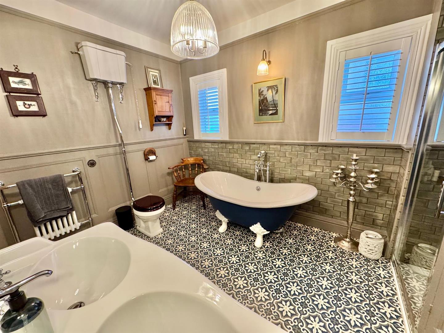 Attractive bathroom suite comprising twin Victorian wash stand with 'his and hers' basins, freestanding roll top bath with claw feet, high level w.c. shower enclosure, wall and floor tiling, timber panelling along one wall, column radiator, towel rail.