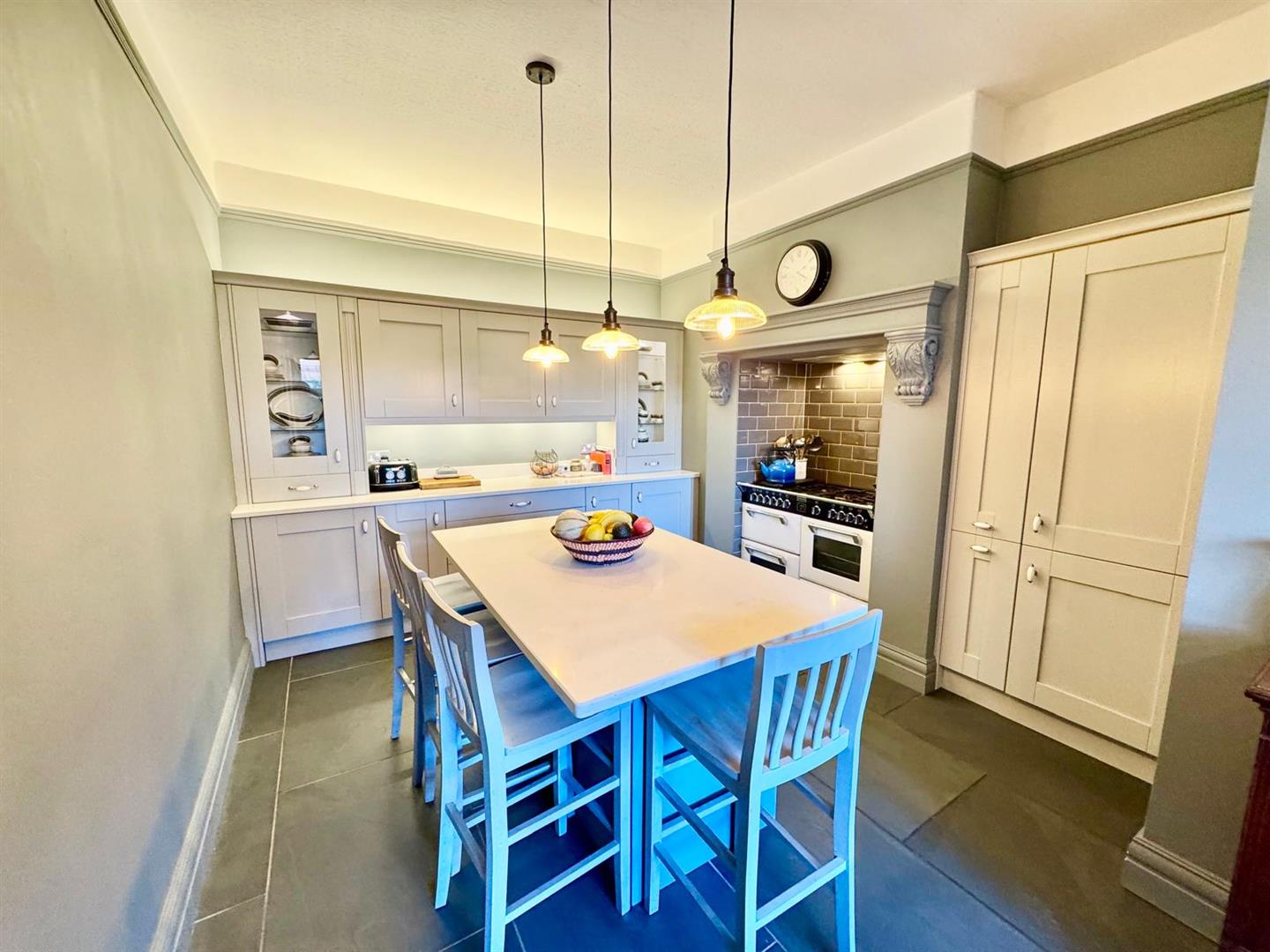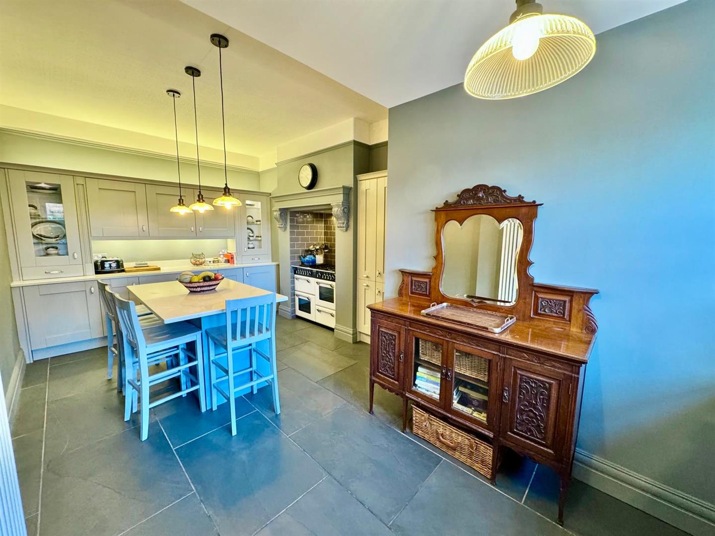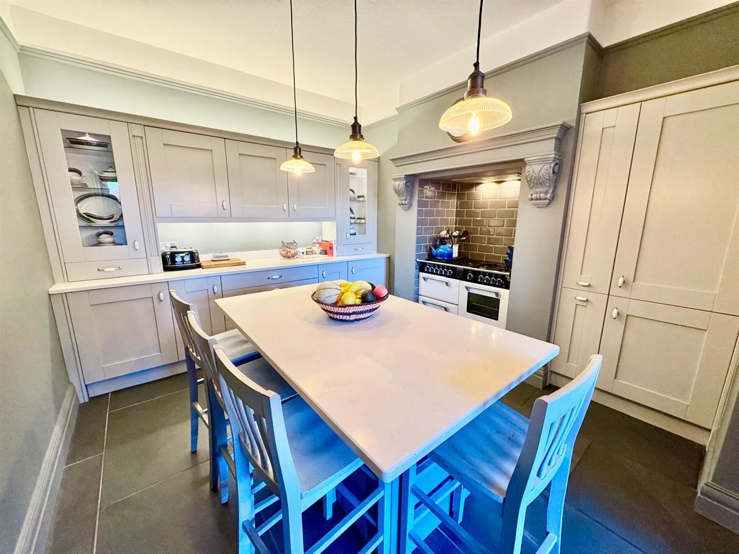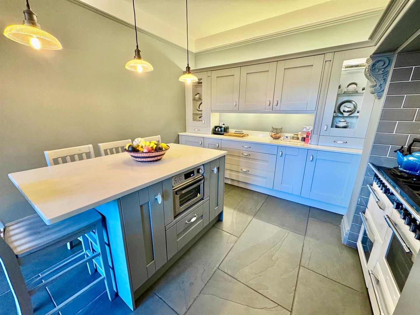 Fitted range of base and wall units with granite worktops, central island with breakfast bar and inset oven, inset microwave, feature recessed former fireplace housing range cooker, timber mantle over, picture rail, display cupboards and integrated fridge, integrated dishwasher, two bowl porcelain Belfast style sink, vertical column radiator.