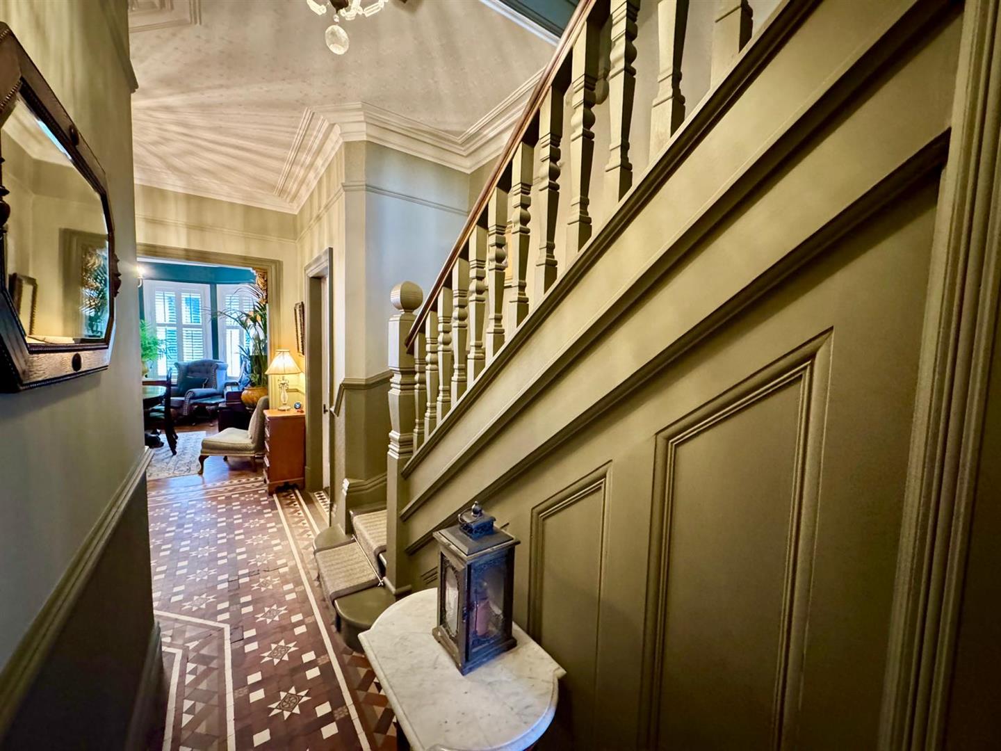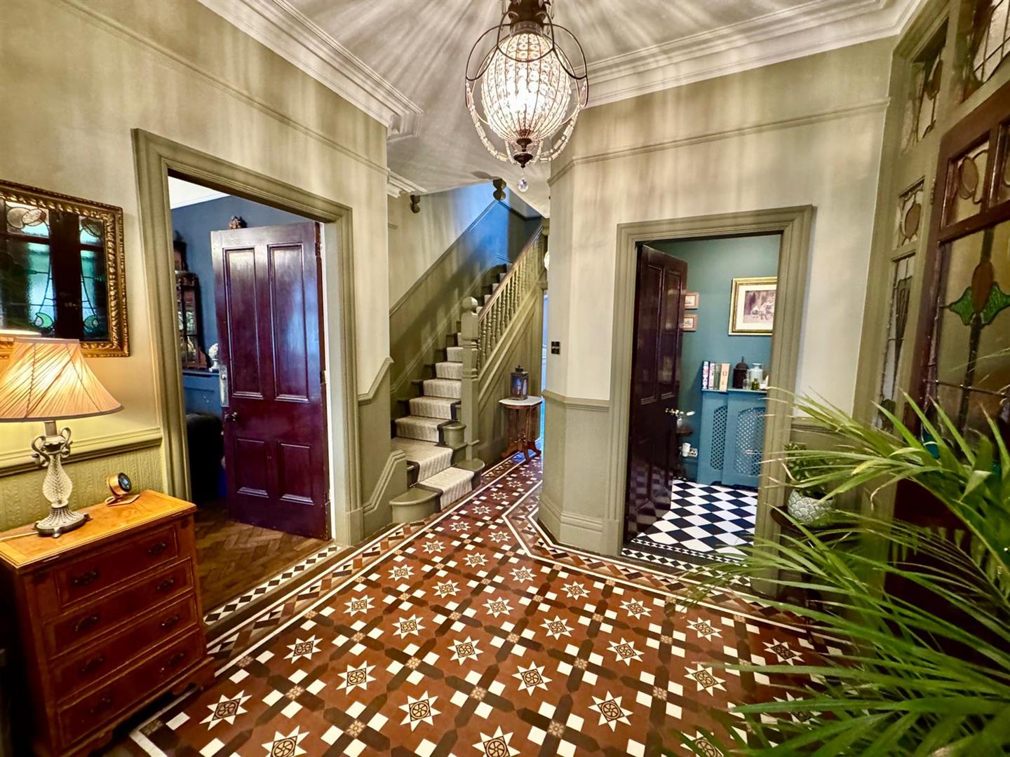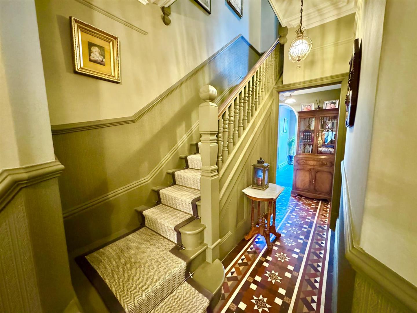 Attractive original Minton style flooring, feature balustrade staircase leading off to first floor level, coved ceiling, picture rail, dado rail.