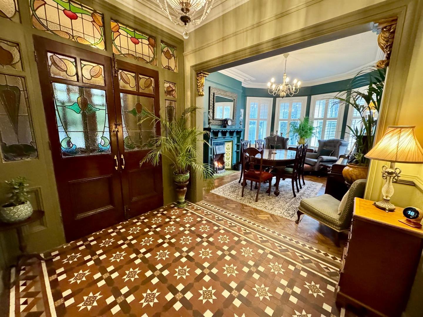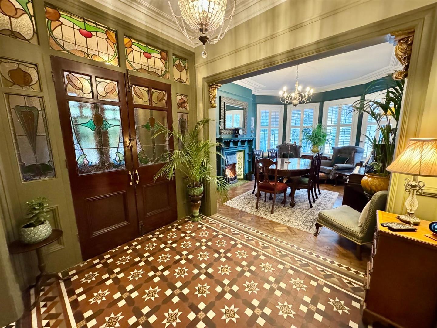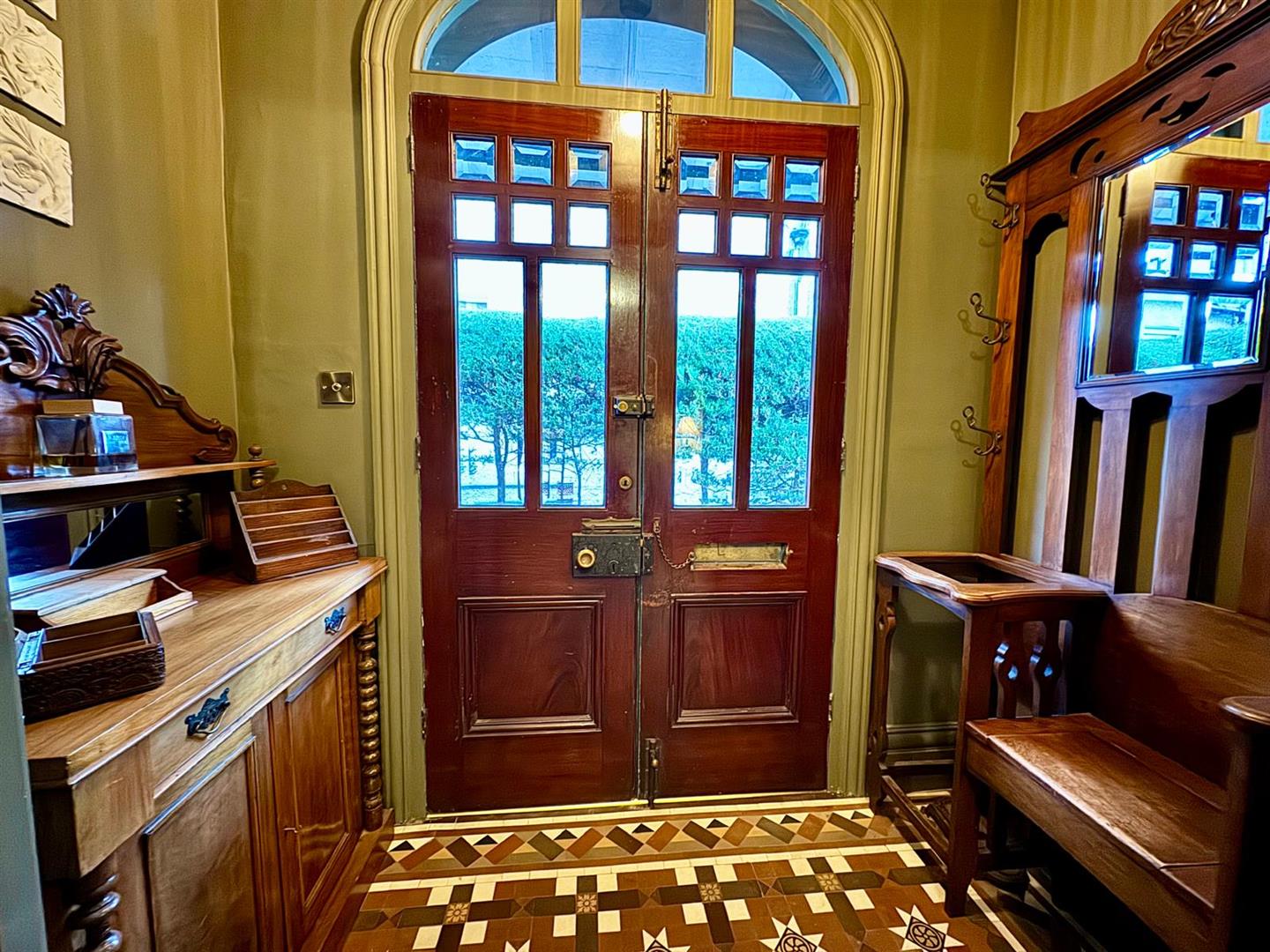 Twin timber and bevelled glass door leading to small entrance vestibule with Minton flooring and original stained and leaded glass timber and glazed doors leading to reception hall.