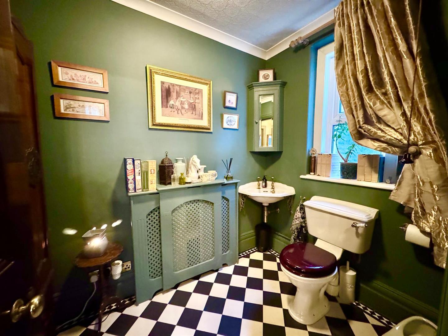 Black and white tiled floor, radiator, coving, corner washbasin, low level w.c.