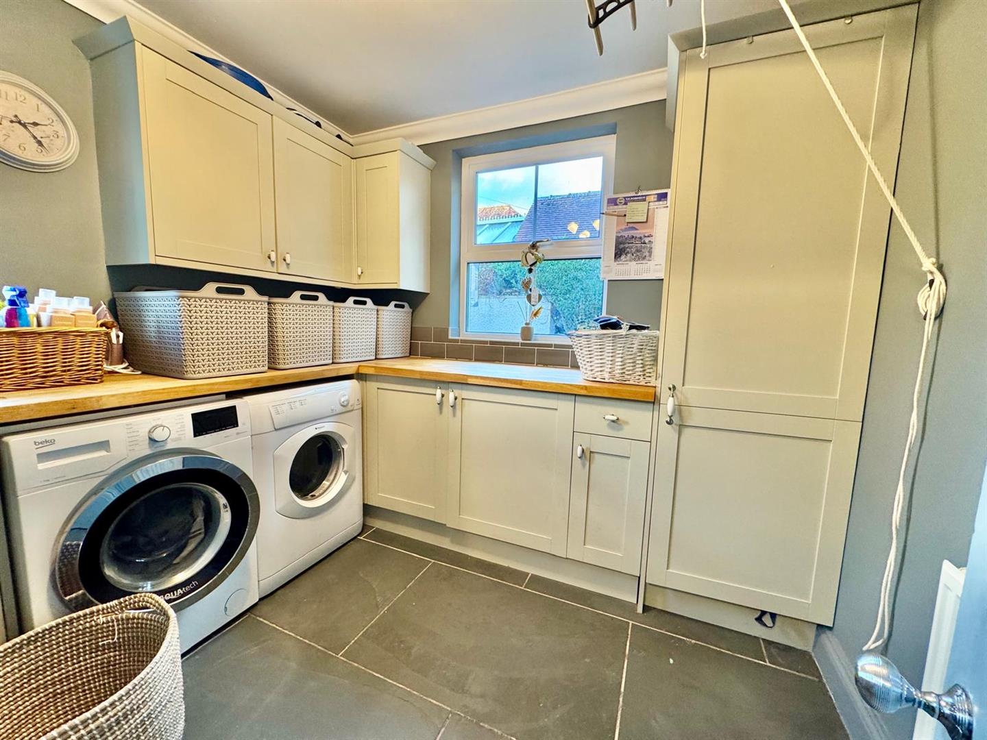 Fitted base and wall cupboards, plumbing for automatic washing machine and space for dryer, tall cupboard housing Worcester central heating boiler, sink with mixer tap, double panel radiator.