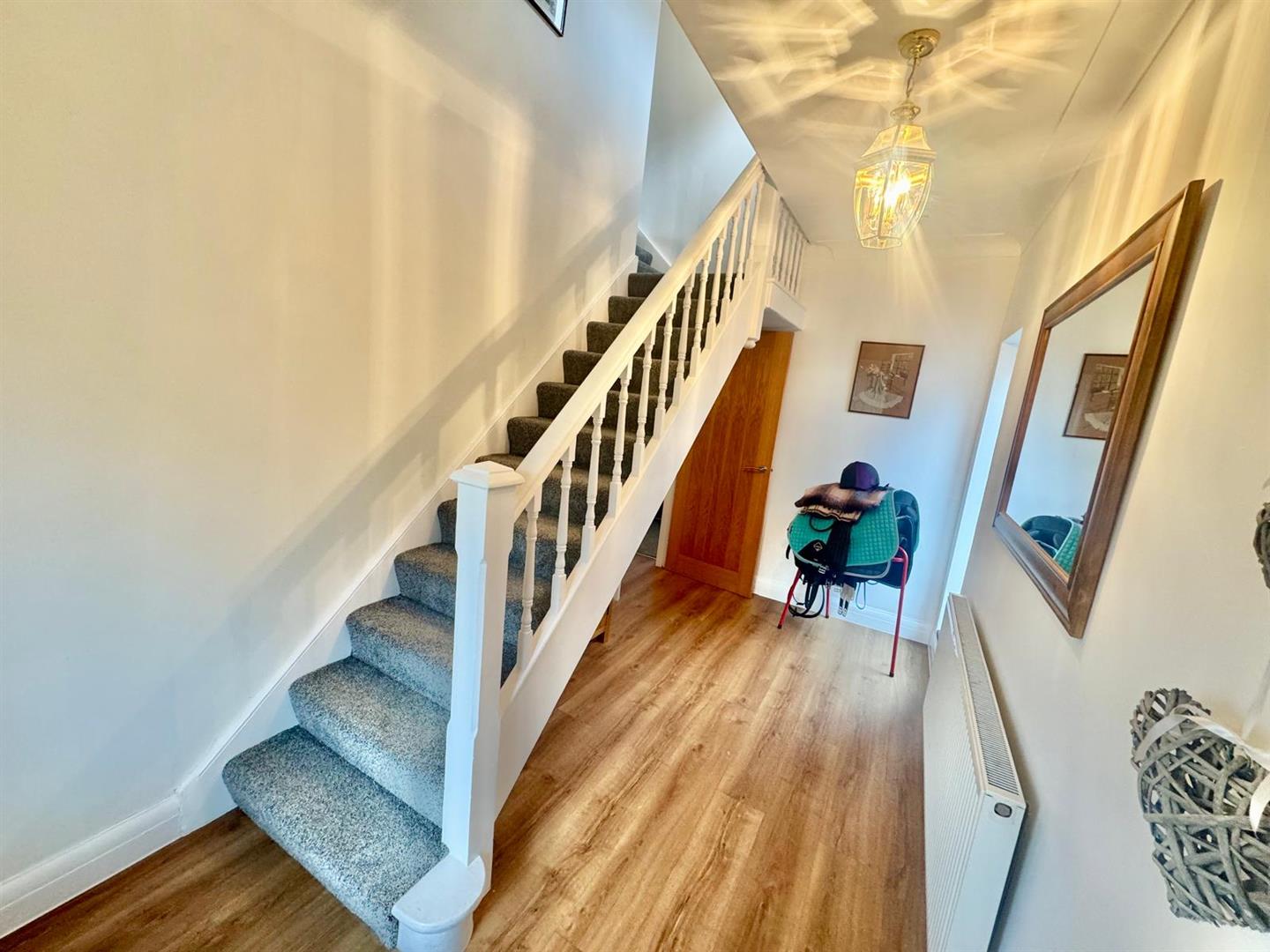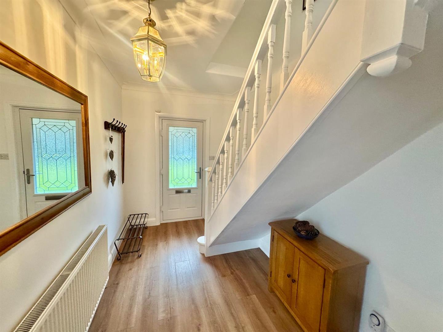 Laminated timber-effect floor, balustrade and spindle staircase leading off to first floor level, double panelled radiator, window to side elevation, composite double glazed front door. Oak door leads to inner hallway.