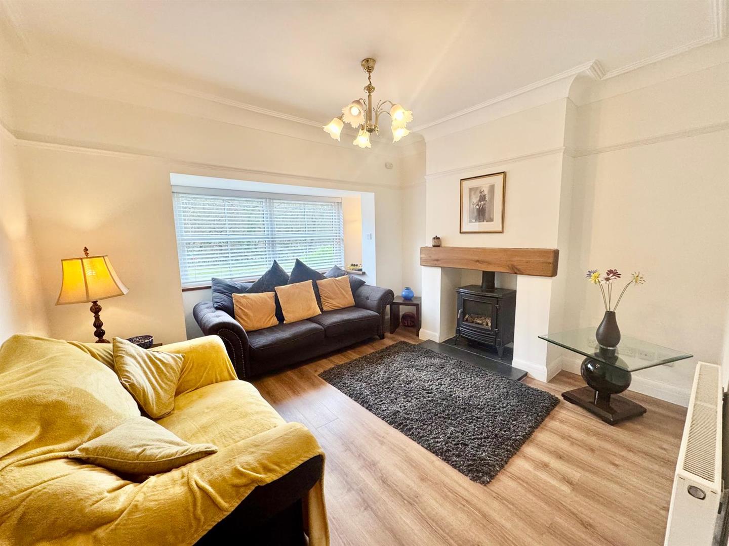 Box bay window looking over the front with views, recess with light and display area, picture rail and coving; gas log effect cast iron stove, slate hearth, double panelled radiator, TV point.
