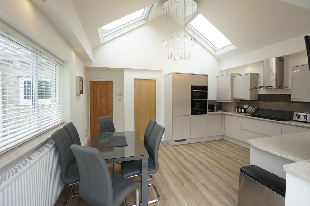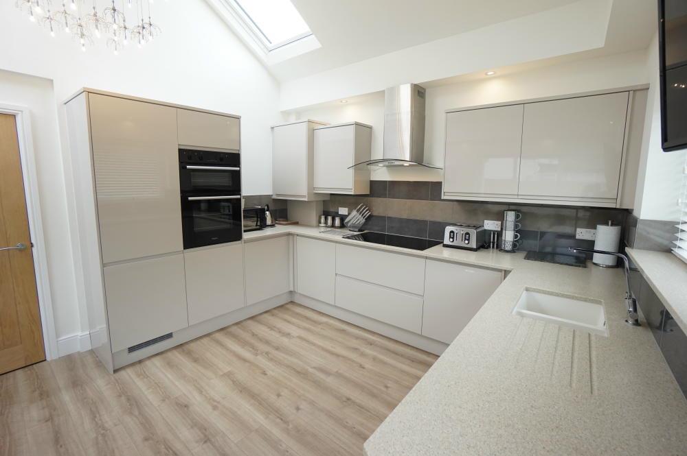 Impressive vaulted ceiling with large velux windows allowing ample daylight and also corner glazing in dining area. Fitted range of modern gloss base and wall units with granite style worktops, five ring induction hob with stainless steel canopy extractor above; inset lighting; 1½ bowl sink with mixer tap; wall tiling; 'Hotpoint' double oven and grill; integrated washing machine; integrated fridge freezer and dishwasher; wall TV point; French windows and corner glazing overlooking rear garden.