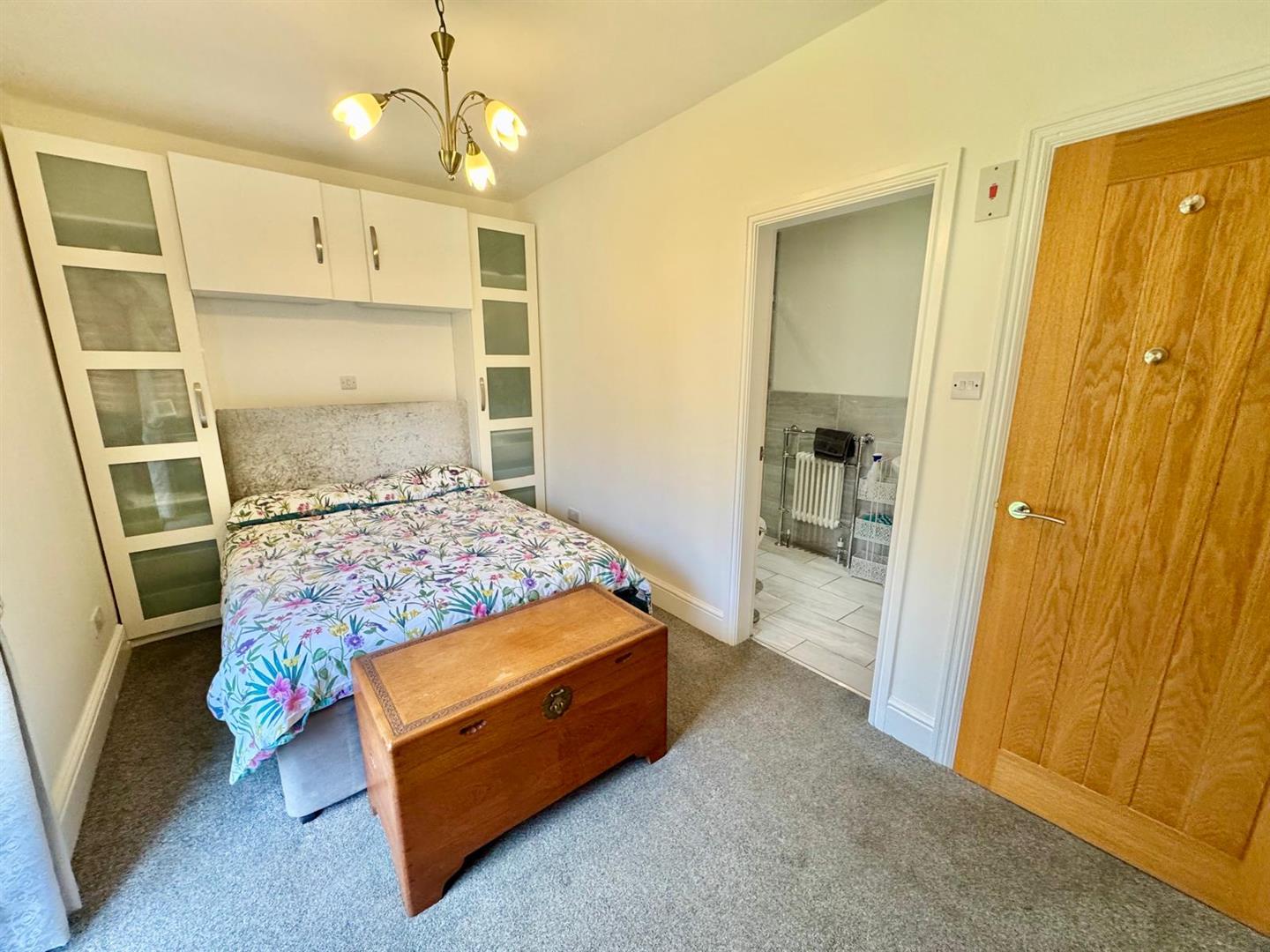 Extending into En-Suite Shower Room. Built-in wardrobes and overhead units; recess for bed; side double glazed french doors leading onto rear garden; double panelled radiator. En-Suite Shower Room: Large walk in shower; pedestal wash hand basin; low level W.C; floor and wall tiling; inset spotlighting; extractor fan.
