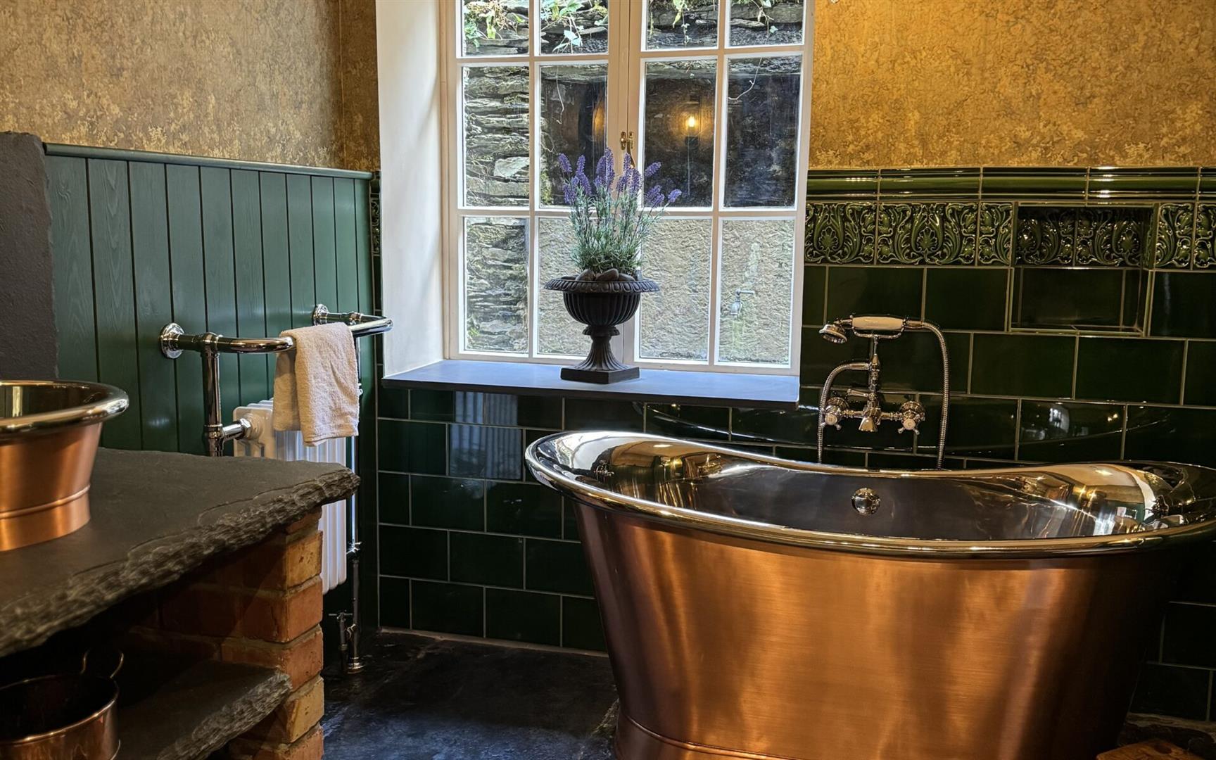 Porcelain sink with wooden worktop and drainer. Rustic brick plinths. Space for fridge. Plumbing for washing machine. Gas cooker point. Slate floor. Double panelled radiator. Window to side elevation. Recessed shelving. Feature slate floors and original recessed fireplace and grate.