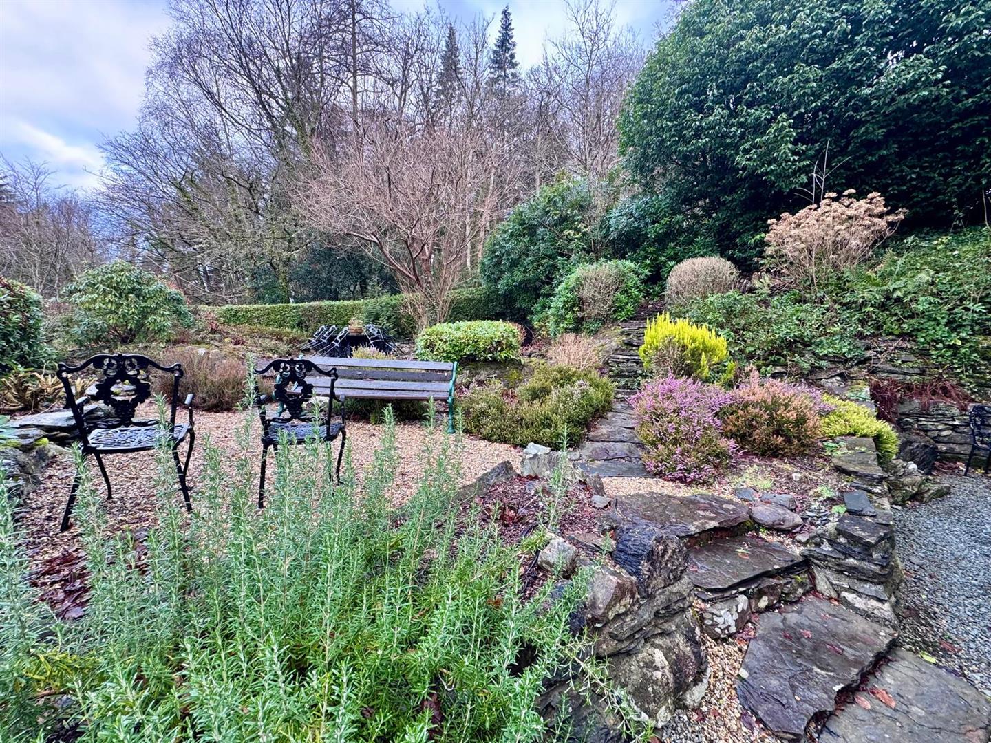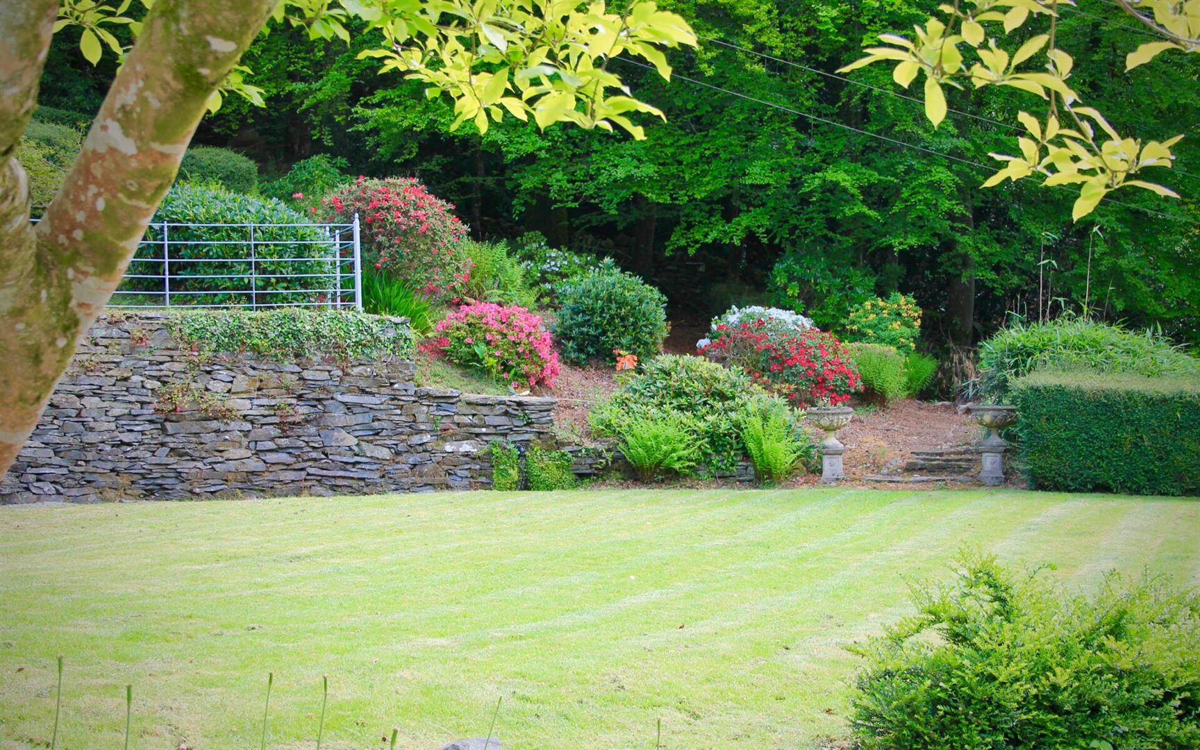 The property is set in large grounds comprising split level garden to side and front. Gravelled driveway with large parking. stone boundary to front and views. Side seating area with specimen planting. The gardens have been improved and landscaped in recent years.