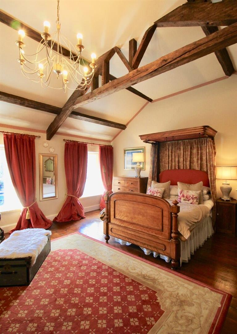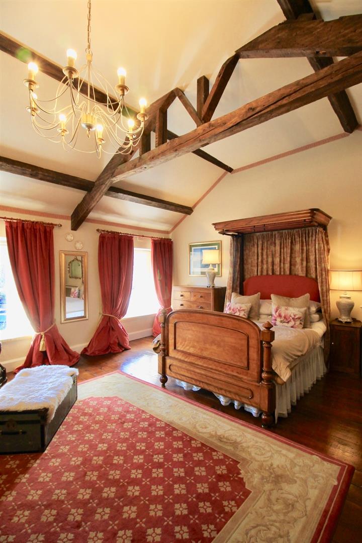 Upstairs, generously proportioned bedrooms include delightful period details such as exposed beams and vaulted ceilings, with attractive views over the gardens and surrounding countryside. The bathrooms are well-appointed, in keeping with the overall quality of the property.