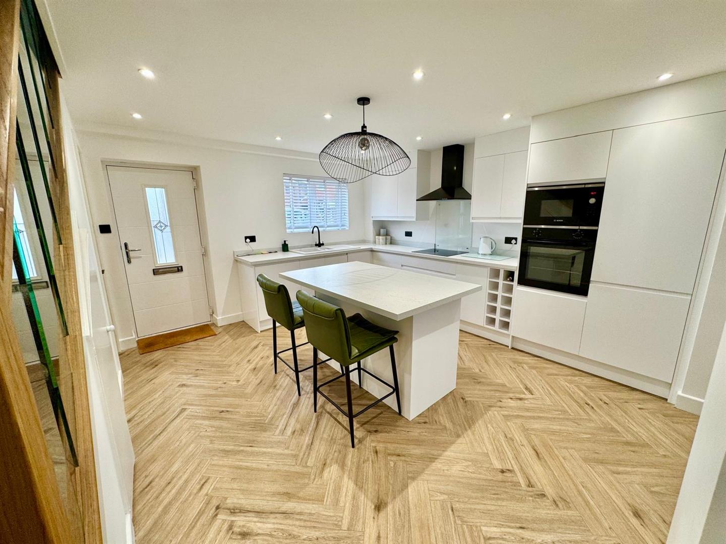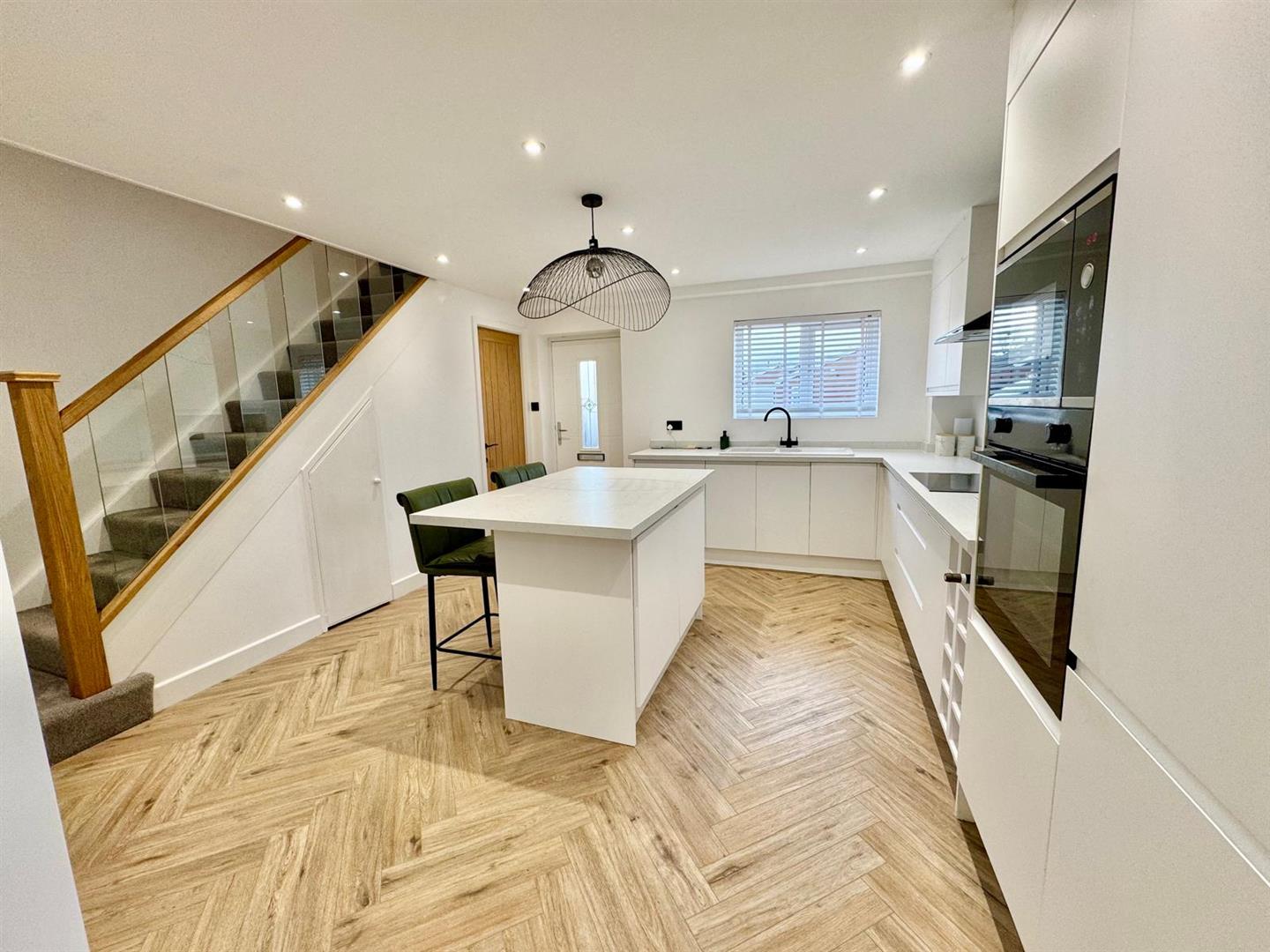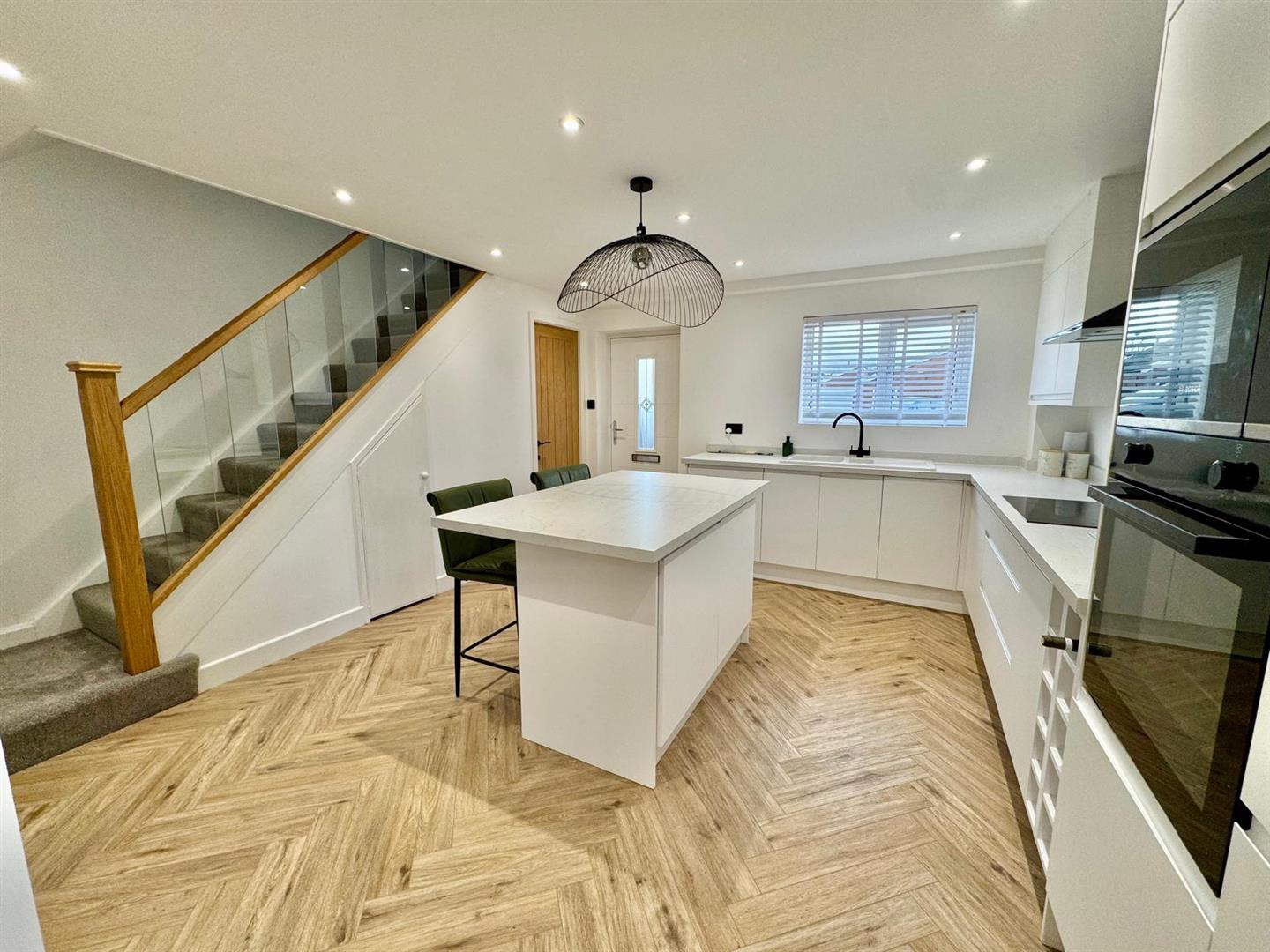 Fitted with a modern range of wall; base and drawer units with complimentary worktops; 1 1/2 inset sink with contemporary black mixer tap; 4 ring induction hob with black extractor above; built in electric oven with microwave above; integrated dishwasher; cupboard housing Worcester gas central heating boiler; integrated fridge freezer; integrated washing machine; UPVC double glazed window to front elevation; inset spotlighting; part glazed feature staircase to first floor level.