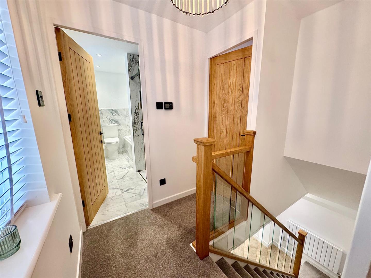 The accommodation briefly comprises a stunning fitted kitchen, complete with modern units, integrated appliances and a central island providing additional workspace and informal seating. A useful ground floor cloakroom/WC, along with an eye-catching oak and glass staircase rising to the first floor.