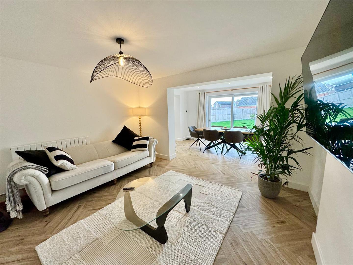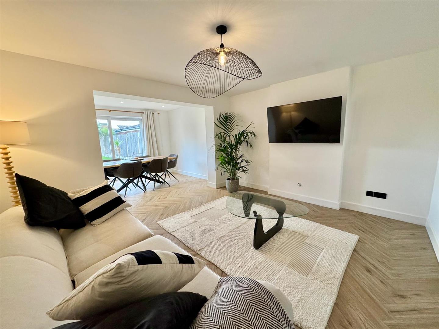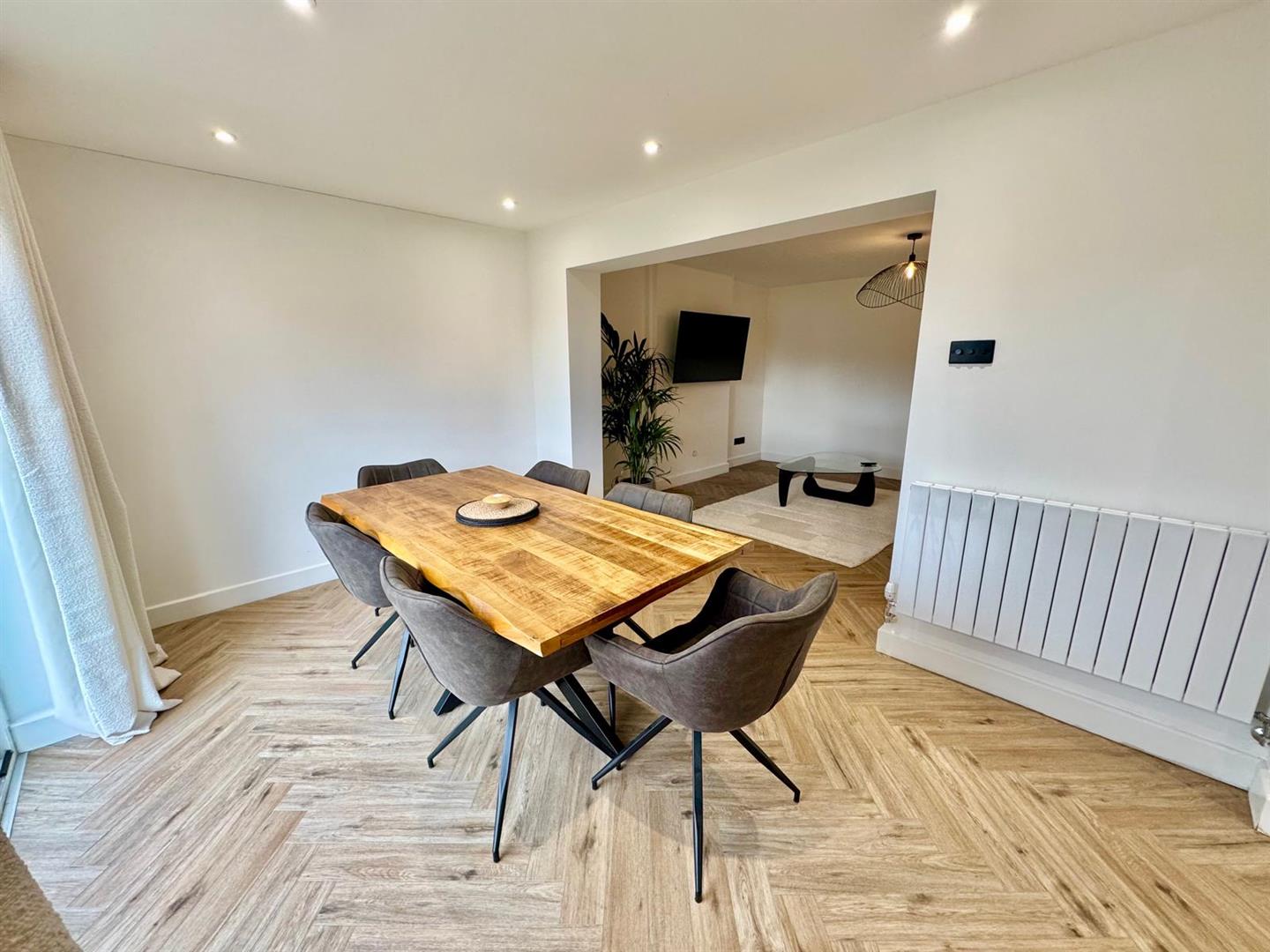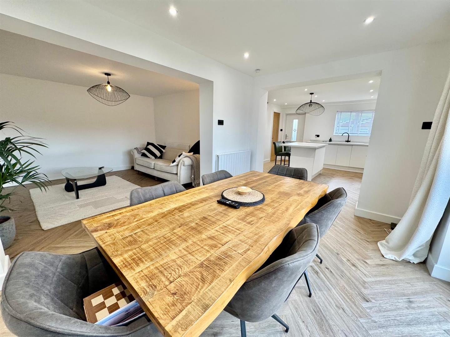 To the rear, a spacious dining room provides an excellent setting for entertaining, with sliding patio doors opening directly onto the side garden. From here, a squared archway leads through to a well-proportioned lounge.