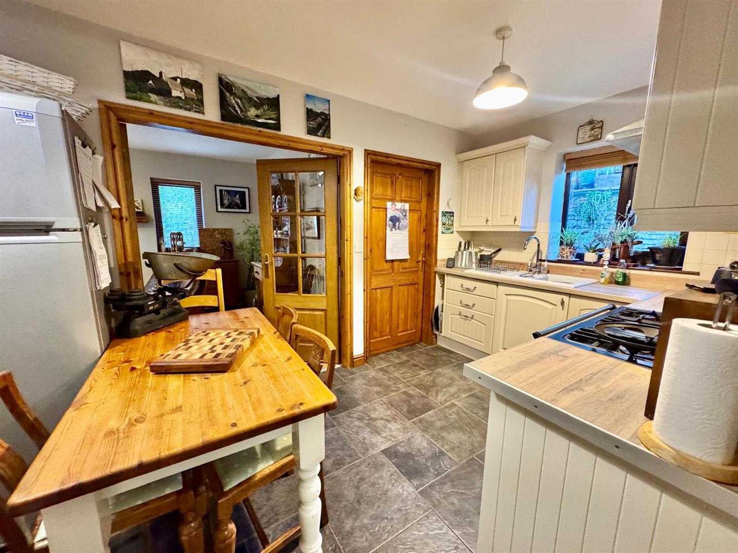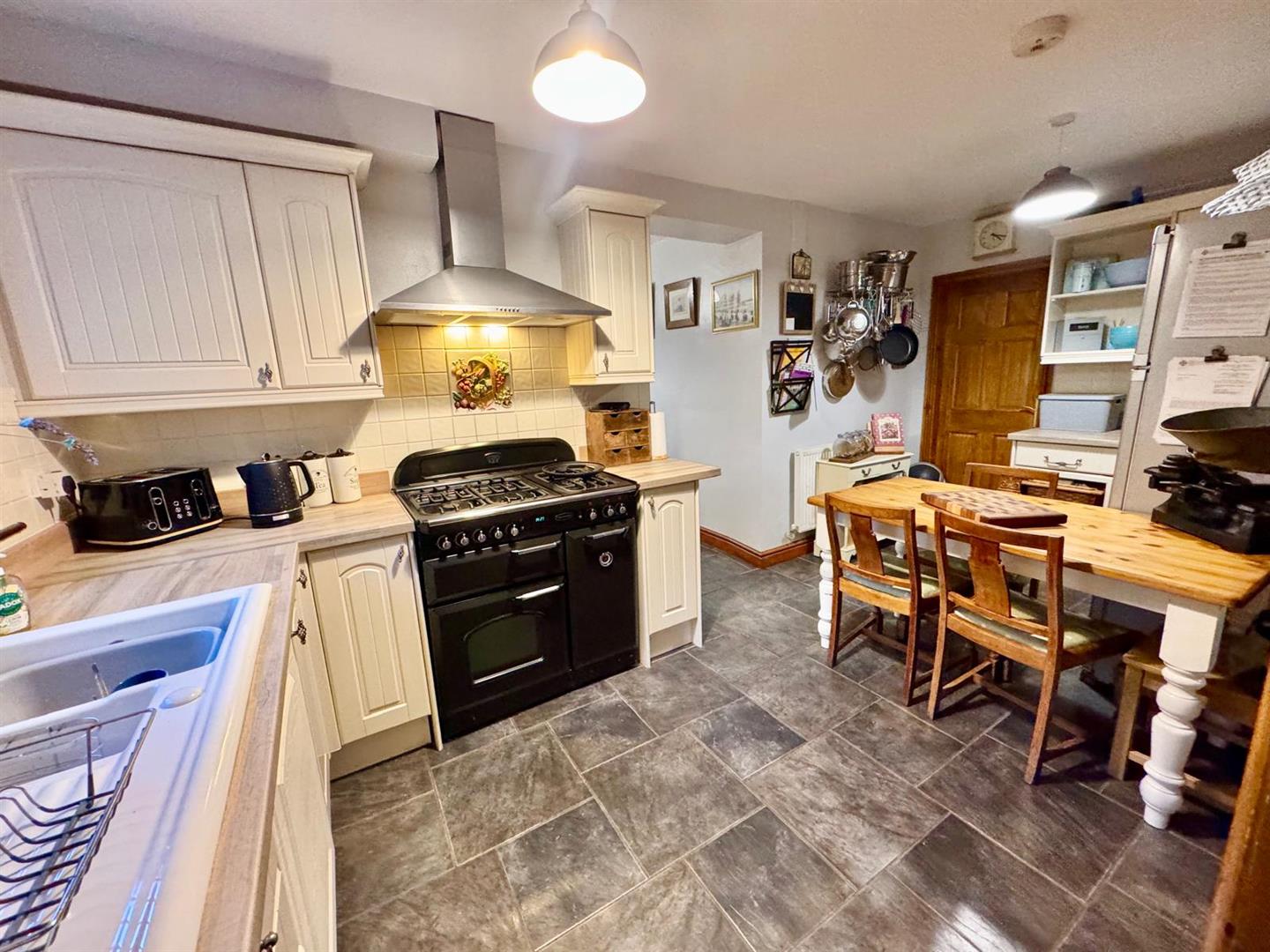 Fitted range of complementary base and wall units with inset porcelain sink; mixer tap; worktops; space for range cooker; stainless steel canopy extractor above; uPVC double glazed window to rear; wall tiling; space for fridge freezer; vegetable pull out basket storage; shelving; radiator; tiled floor; doorway leading to: