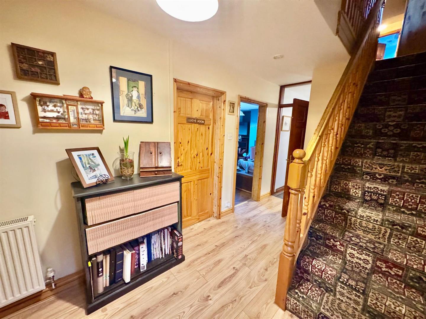 Balustrade and spindle staircase leading off to first floor level; laminated timber effect floor; double panelled radiator; cloak hooks.