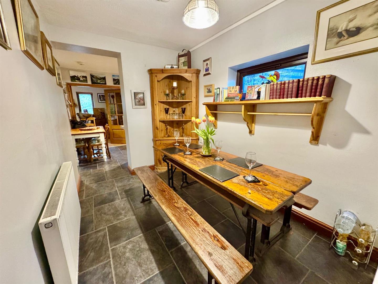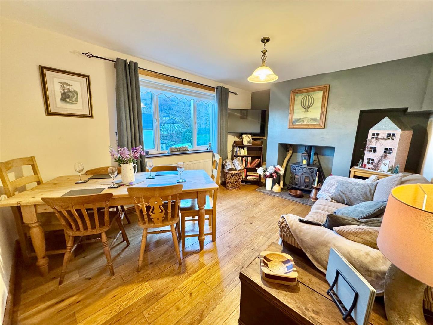 Engineered oak flooring; feature Inglenook style fireplace with cast iron stove; slate hearth; recessed alcoves; TV point; double panelled radiator; uPVC double glazed window overlooking front enjoying extensive views.