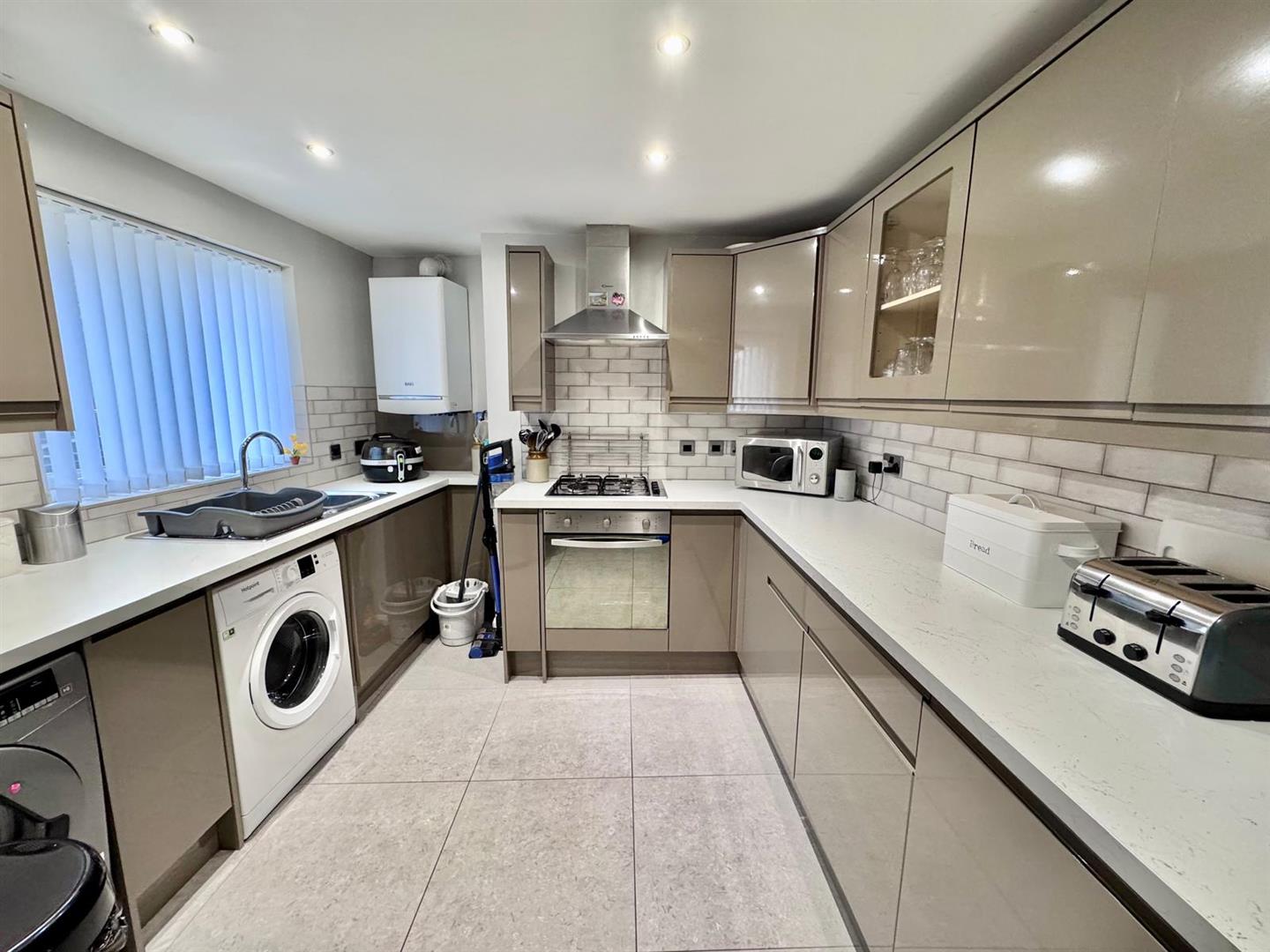 Fully fitted range of modern base and wall units with complementary worktops; single drainer sink with mixer tap; plumbing for automatic washing machine and dishwasher; attractive wall tiling; integrated stainless steel oven and four ring gas hob with canopy stainless steel extractor hood above; space for fridge freezer; pull out draw units; radiator; tiled floor; wall mounted 'Baxi' central heating boiler for central heating and hot water; inset spotlighting; uPVC double glazed window overlooking rear.