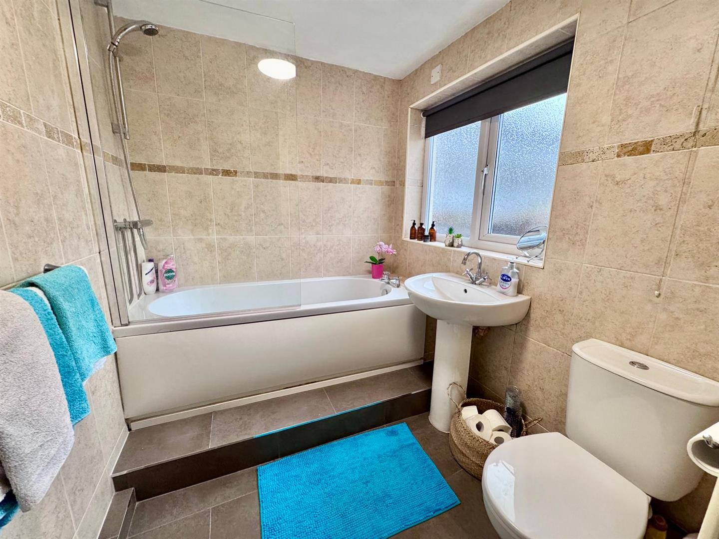Slightly raised panelled bath with mixer shower and shower screen; pedestal wash hand basin; low level W.C; ladder style heated towel rail; uPVC double glazed window overlooking rear; fully tiled walls and floor.