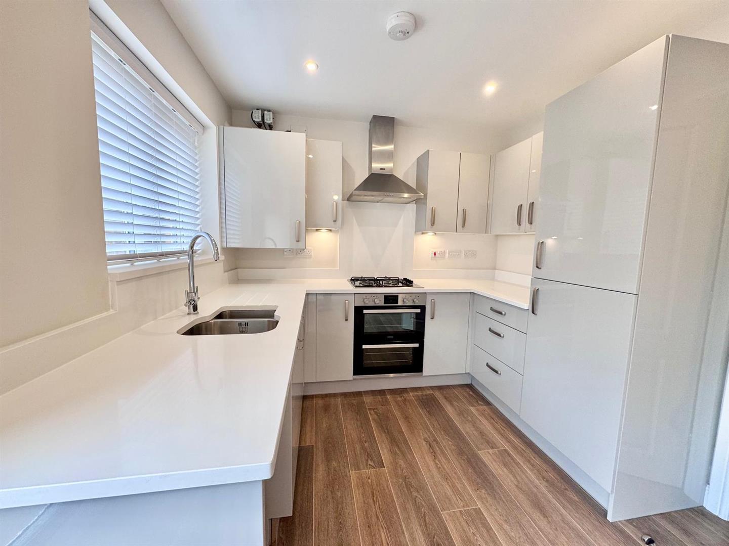 Kitchen with fitted range of modern gloss base and wall units with composite stone worktops; integrated fridge freezer; stainless steel double oven and grill; gas hob and canopy stainless steel extractor above; plumbing and space for washing machine or dishwasher; UPVC double glazed window overlooking rear; built in cupboard housing central housing boiler.