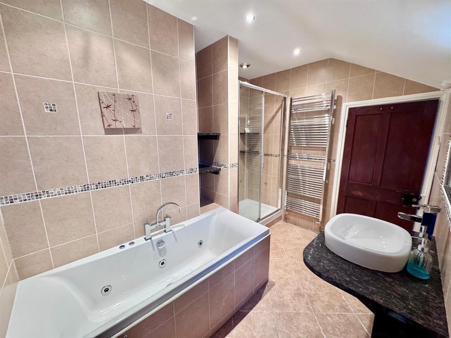 Spacious four piece modern suite comprising 'Whirlpool' bath; large shower enclosure with oversized contemporary shower head; attractive modern washbasin with granite worktop and washbowl; low level WC. Granite windowsill and shelving in recessed surround; wall lights; fully tiled walls and floor; ladder style heated towel rail.