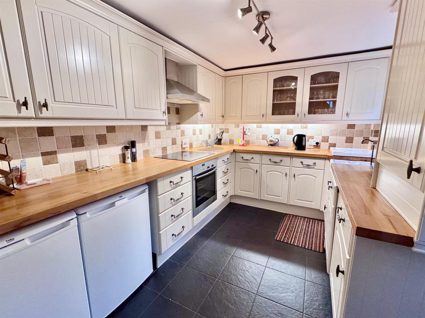 Fitted range of cream base and wall units with beech worktops; integral dishwasher, washing machine, fridge and freezer; built-in cupboard housing 'Worcester' combi boiler for central heating and hot water. Integral stainless steel oven with ceramic hob and stainless steel canopy extractor above; Belfast style sink with antique mixer tap; uPVC double glazed window and door to rear; floor tiling; double panelled radiator.