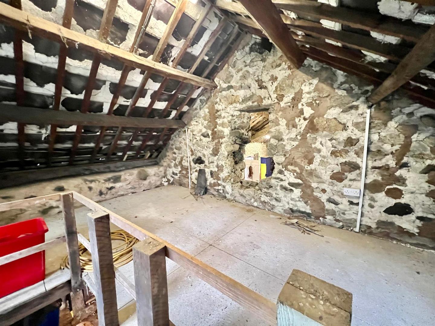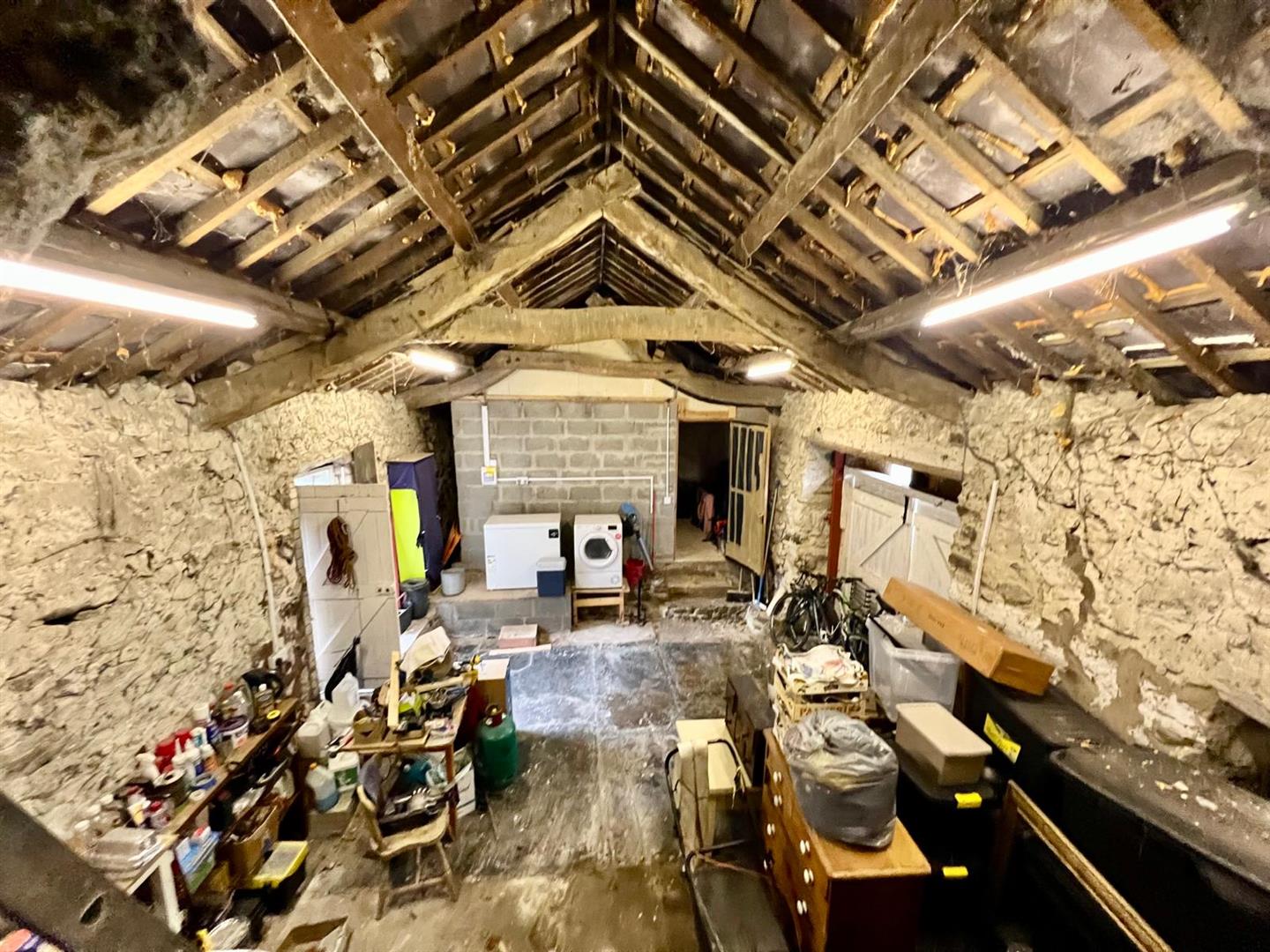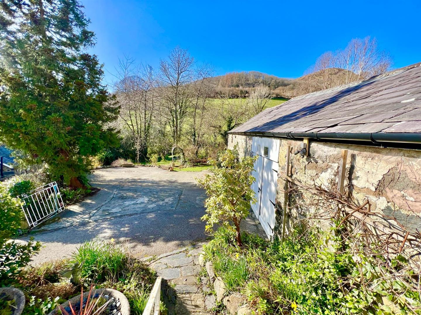 The property is situated in an elevated position in a good sized plot; Hard standing and turning area for several vehicles. Adjacent to the parking area attached to the main house are a range of stone outbuildings currently used as garage and workshop with twin timber doors.