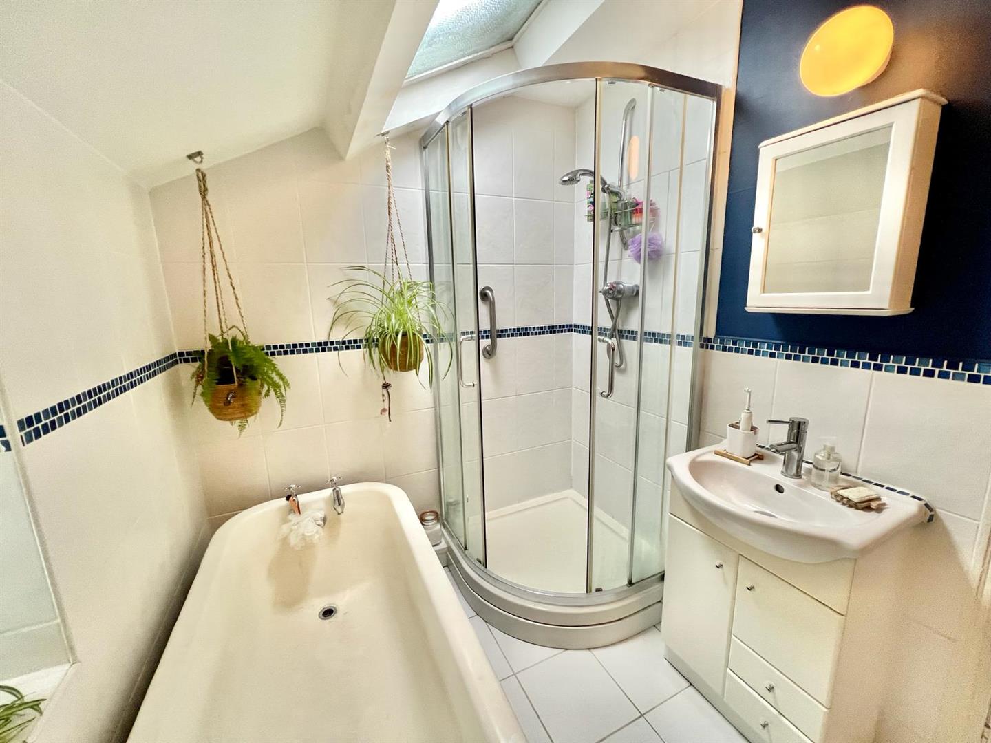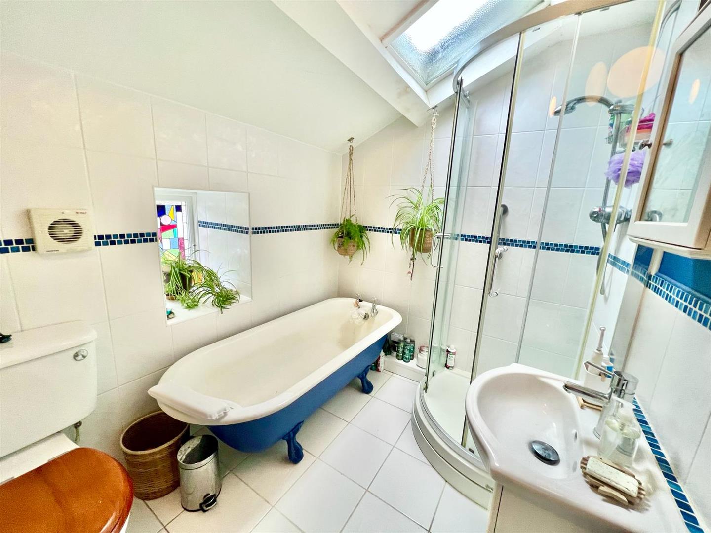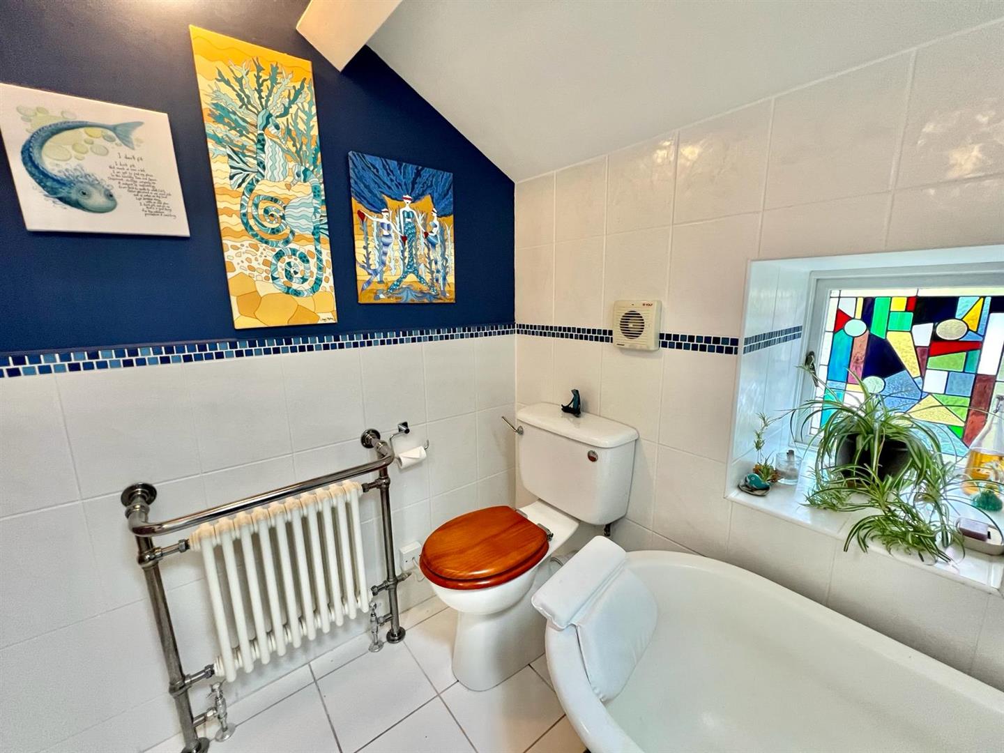 Three piece suite comprising roll top bath, corner shower enclosure, vanity wash basin, low level WC; column radiator and towel rail; wall and floor tiling, extractor fan.