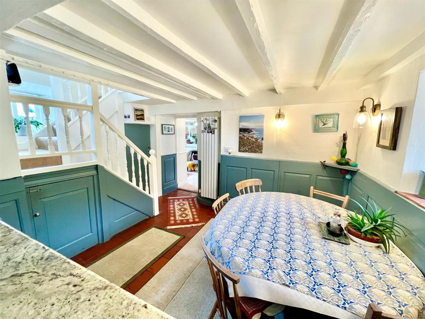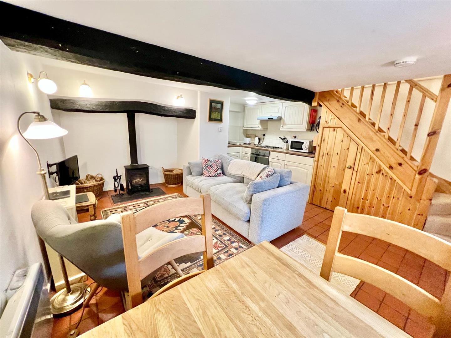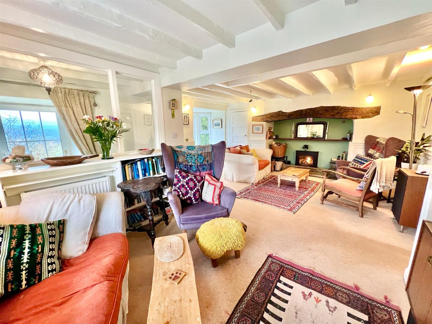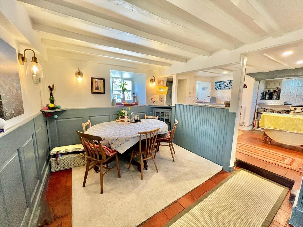Feature inglenook fireplace with substantial timber lintel over; cast iron multi-fuel stove on slate hearth; exposed beam ceiling; half timber panelled walls; built-in storage cupboard; bay window overlooking front enjoying extensive views. Side Reading Area: Half timber panelled walls; built-in book shelving; storage heater; bow window overlooking side enjoying views up the Conwy Valley. Doorway to Dining Room.