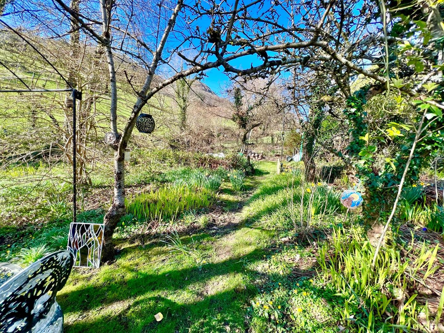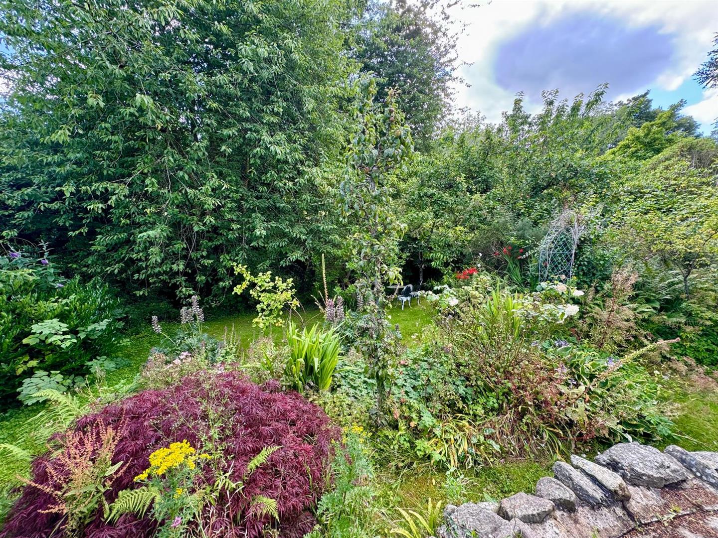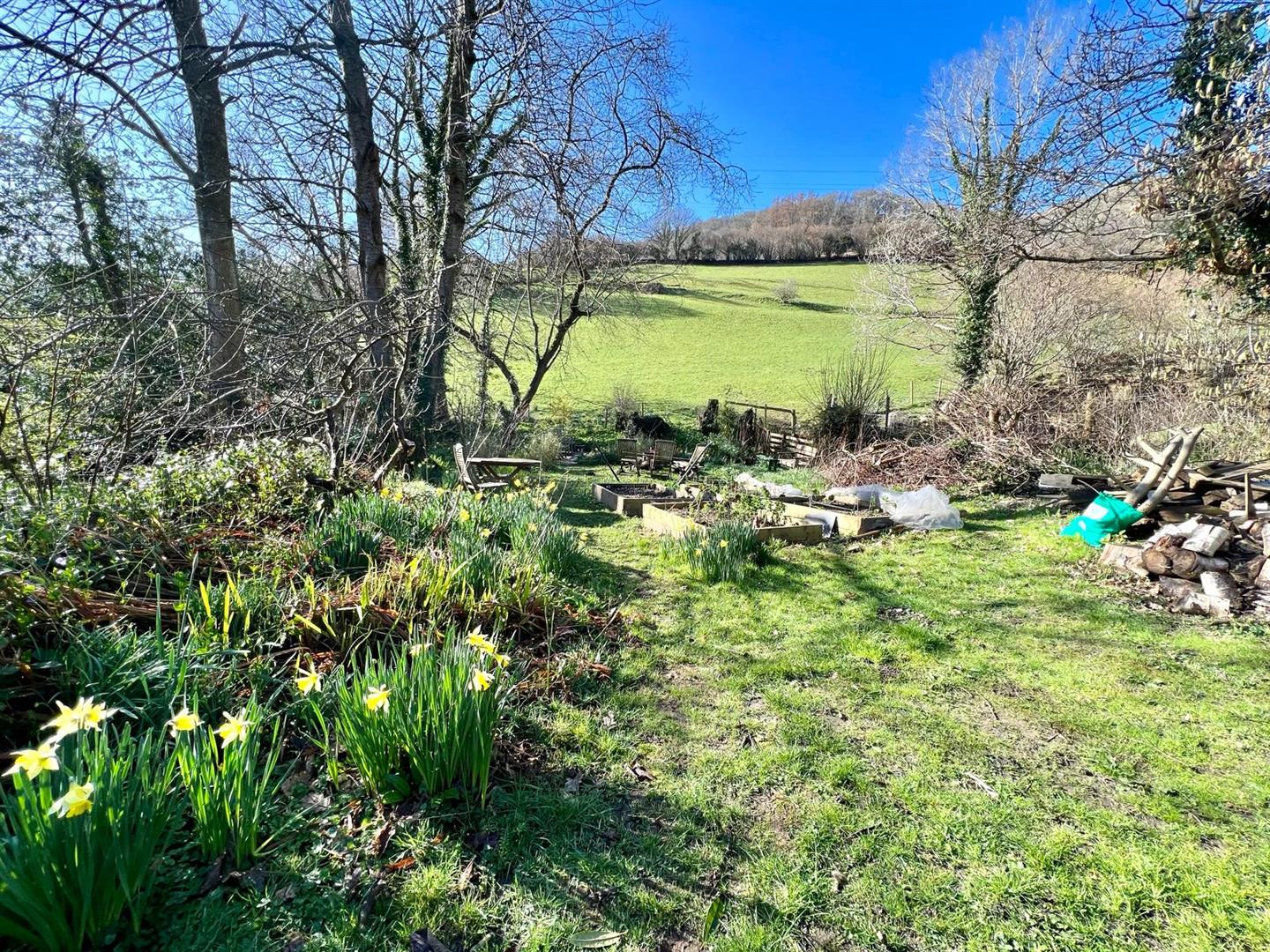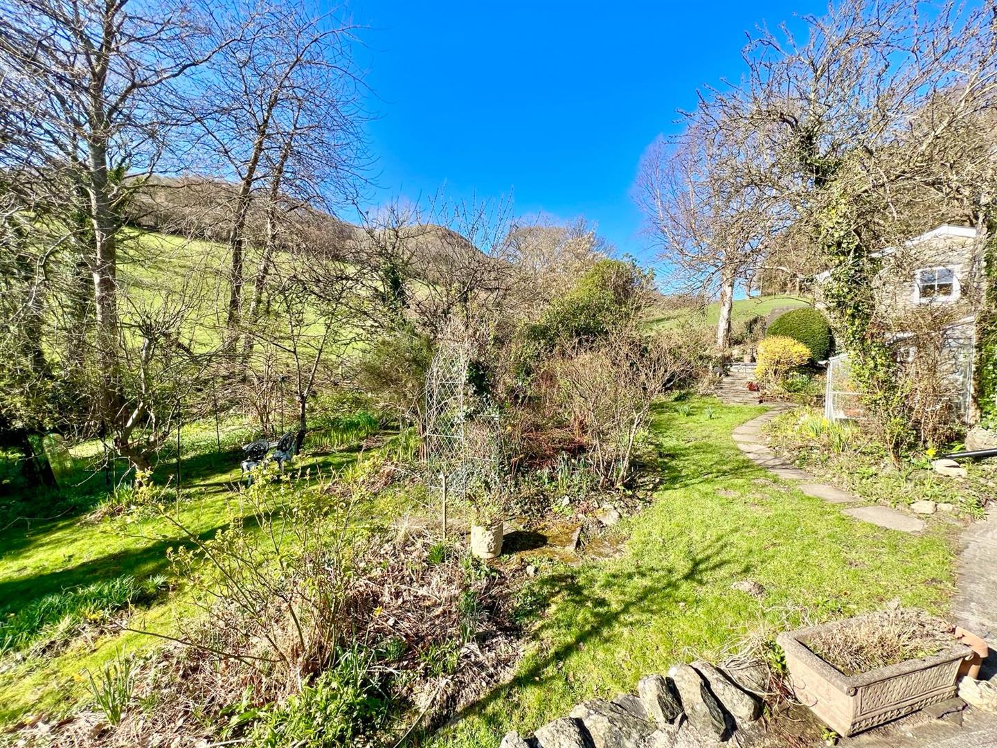The property has a large cottage style garden which runs away from the house towards a small stream at the bottom with a small bridge over the stream. Mature trees, shrubs and fruit bearing bushes. Grassed areas.