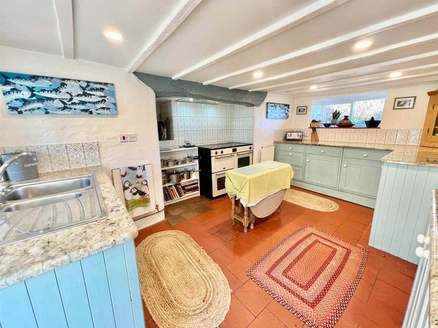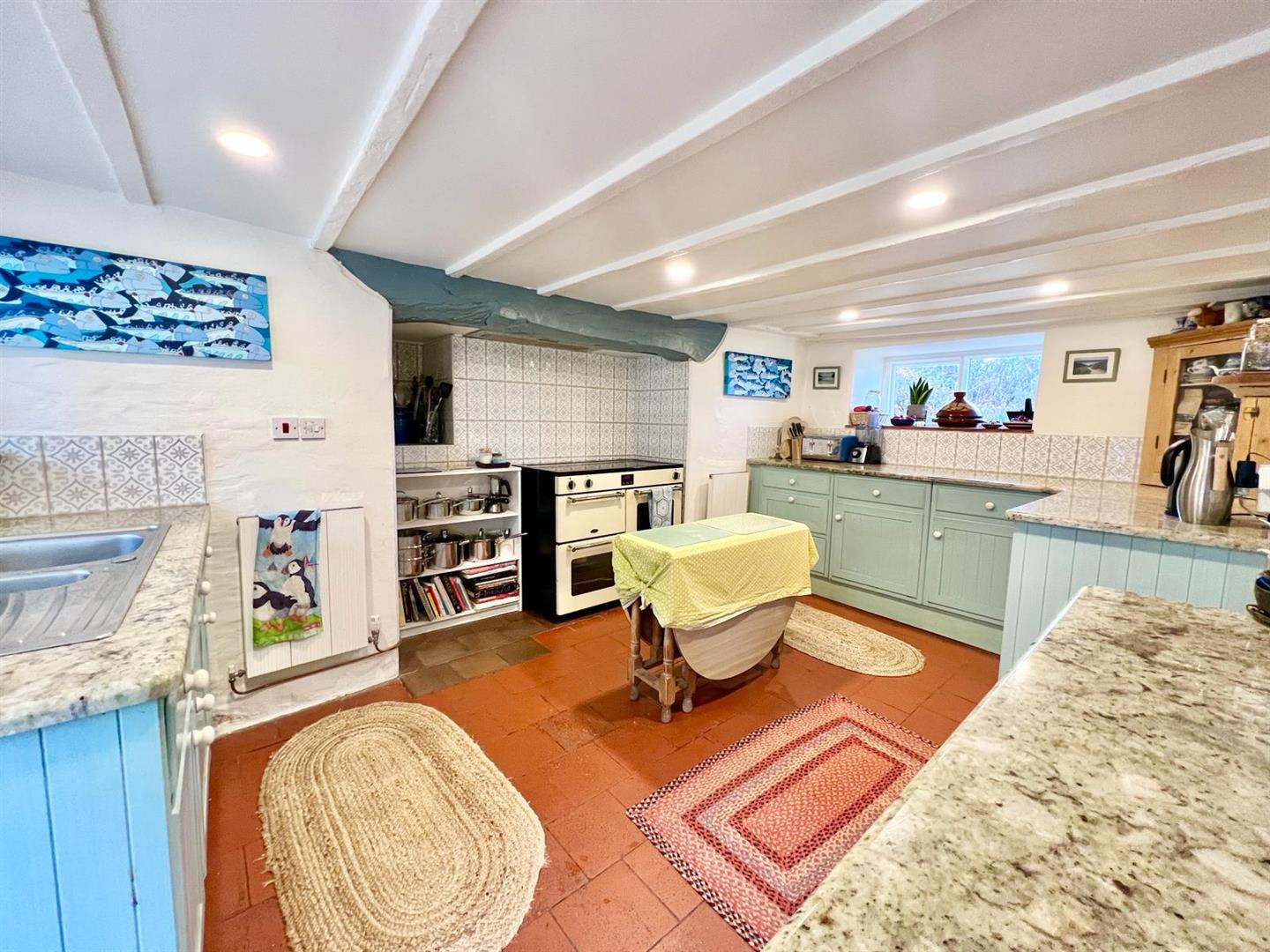 Fitted range of base units with granite worktops; quarry tiled floor; 1 ½ bowl sink with mixer tap; feature recessed inglenook style fireplace housing range cooker; inuilt under counter fridge and dishwasher; recessed shelving; inset lighting; beam ceiling; window overlooking side elevation. Timber and glazed door leading to: