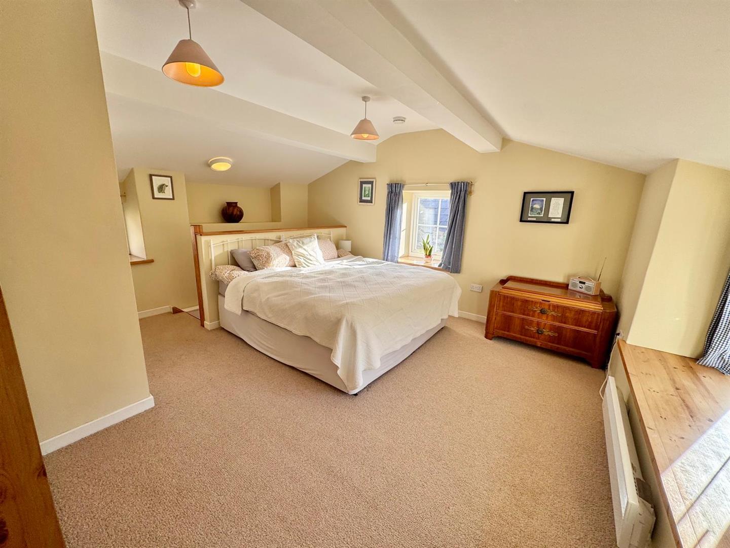 Large bedroom with uPVC double glazed window to front and side elevation; built-in wardrobe; wall mounted electric heater; vaulted ceiling;