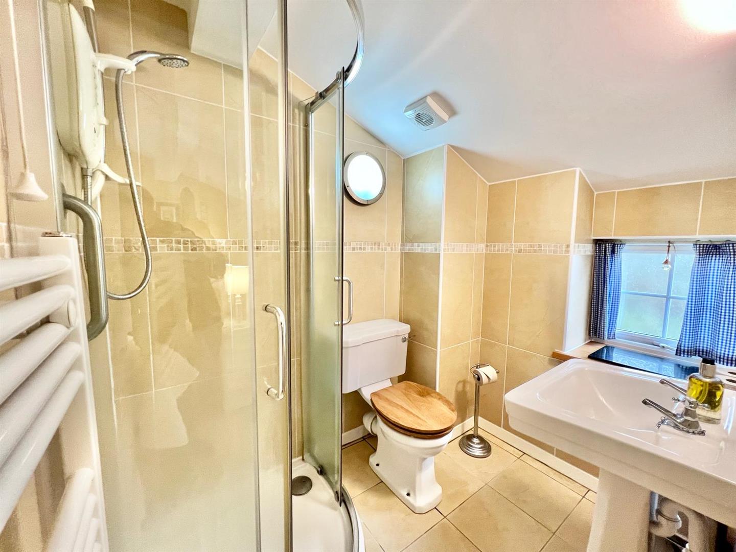 Corner shower enclosure; electric shower, low level WC and wash hand basin; fully tiled walls; extractor fan.