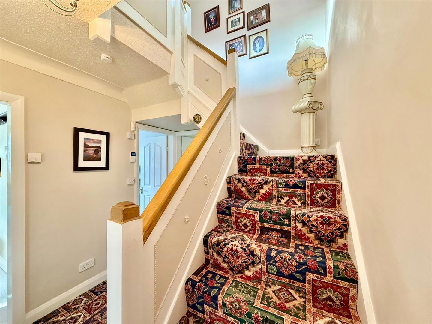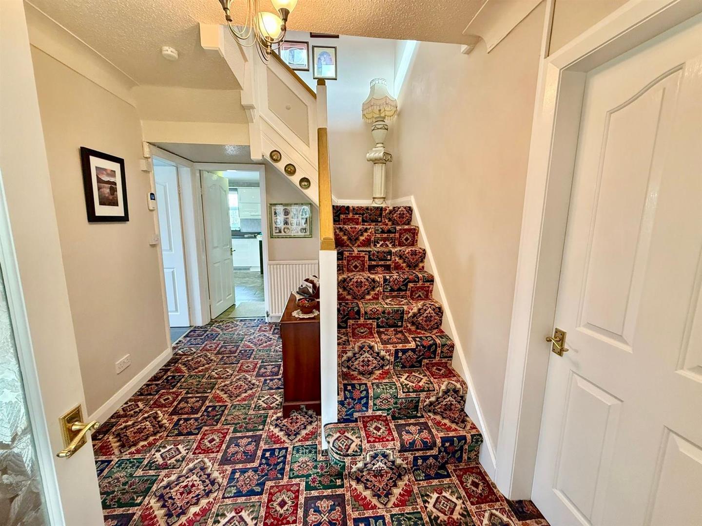 Part glazed door, staircase to first floor, understairs storage cupboard, telephone point, coved ceiling, radiator.