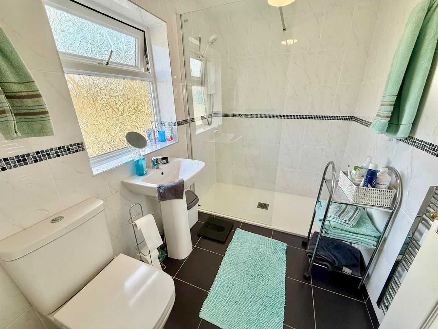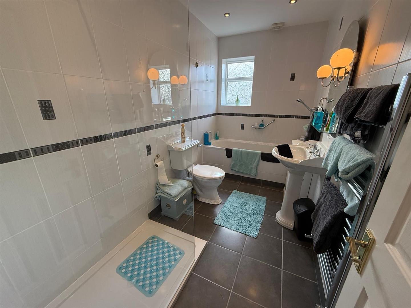 Large shower enclosure with glazed panel and Mira shower fitment, low flush w.c.; wash hand basin; fully tiled walls, tile flooring, heated towel rail, Upvc double glazed window.