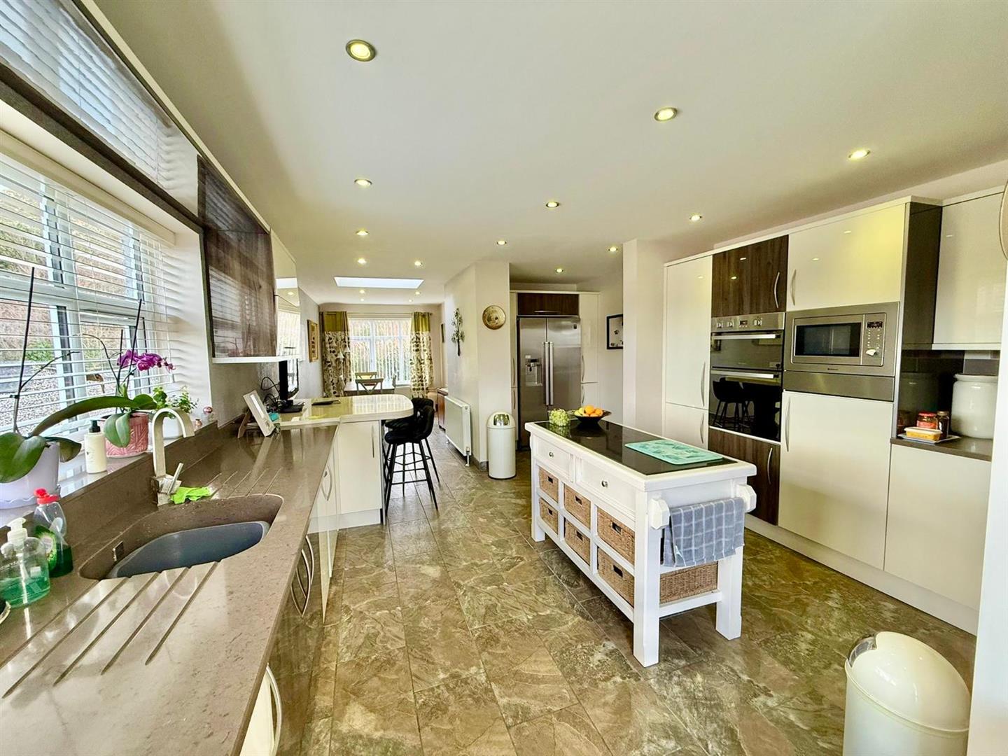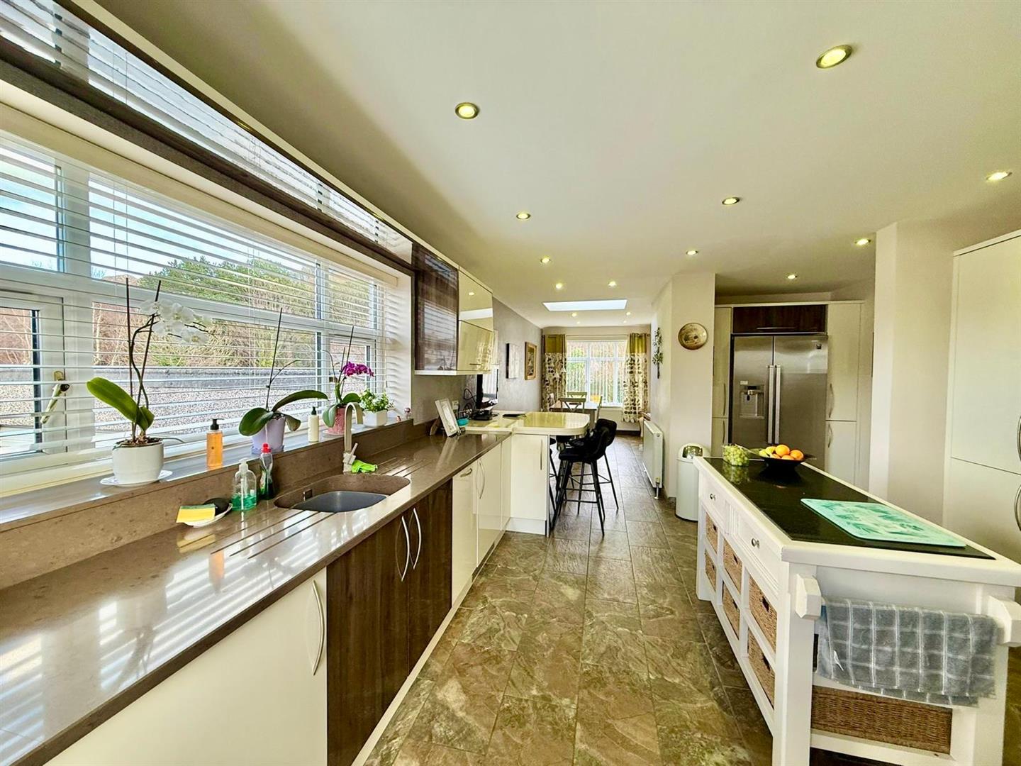 Fitted with a modern range of base, wall and drawer units with complimentary work surfaces over incorporating a breakfast bar area, inset sink unit, integrated dishwasher, space for washing machine, space for tumble dryer; eye level double oven, integrated microwave with warming drawer below, 4 ring Induction hob with extractor hood over, space for "American" style fridge freezer, tile flooring, inset spotlighting, radiator, part tiled walls, UPVC double glazed windows with views, Velux window to ceiling in dining area, Upvc double glazed rear door.