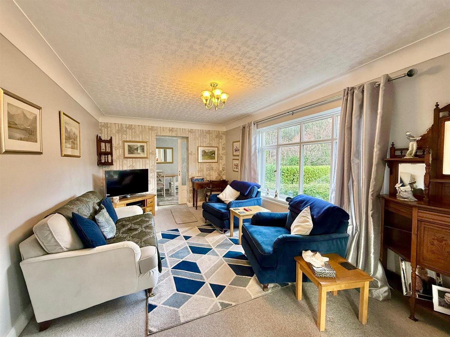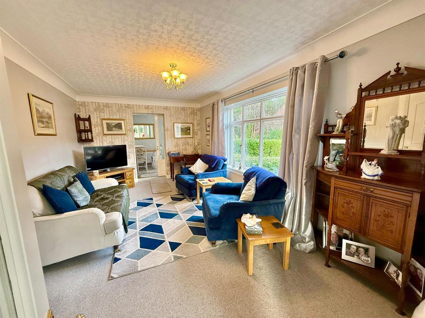 The property stands within generous, well-established grounds enjoying views to the surrounding area. To the rear there are extensive grounds bordered by mature trees, shrubs and hedging, large double garage, ample parking and additional under house storage rooms. The front garden is laid to lawn with mature shrubs and flower borders.