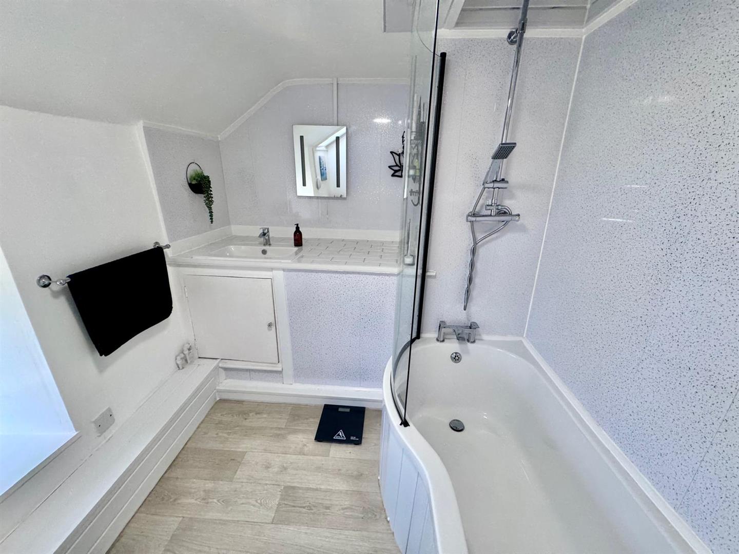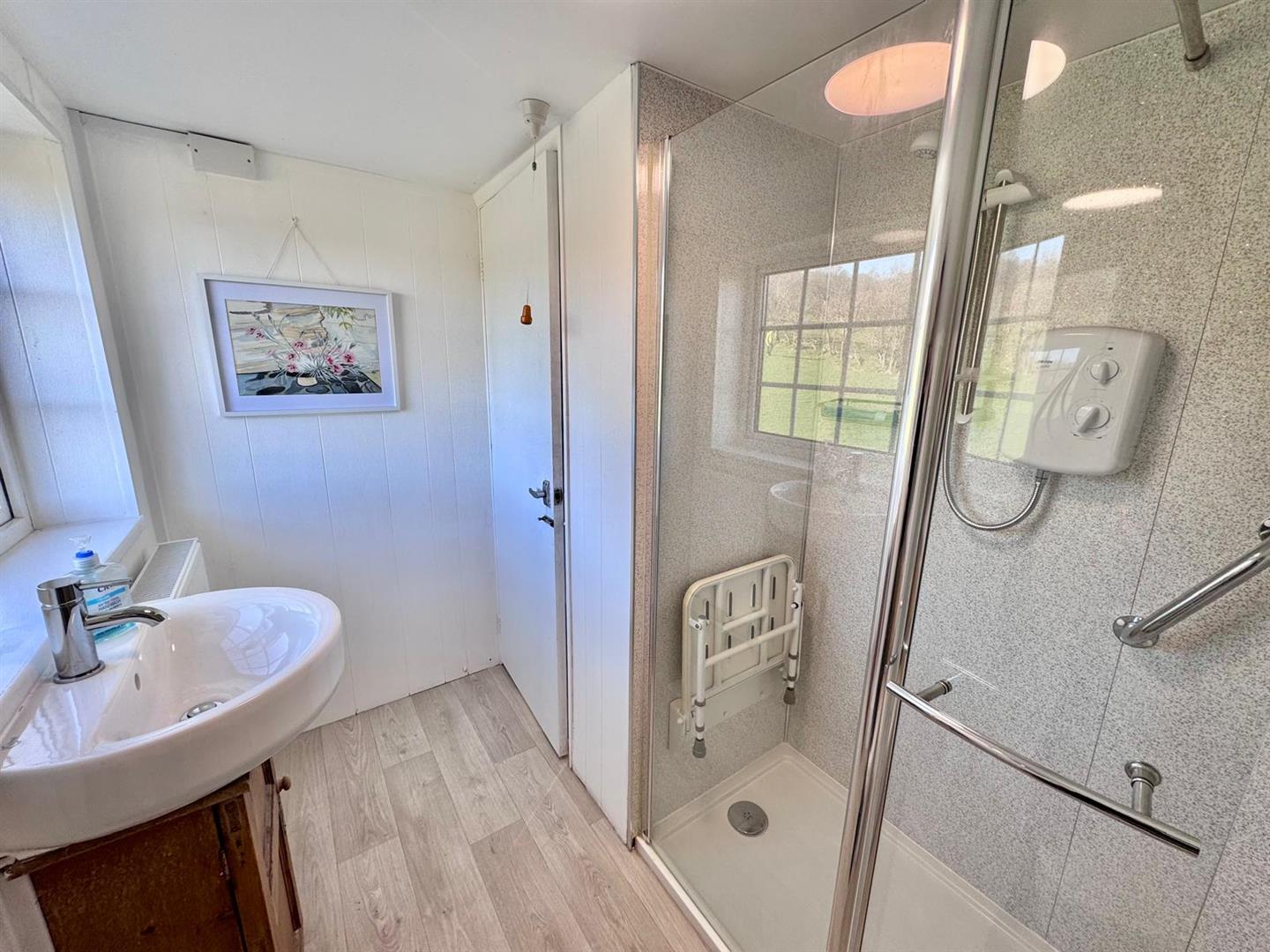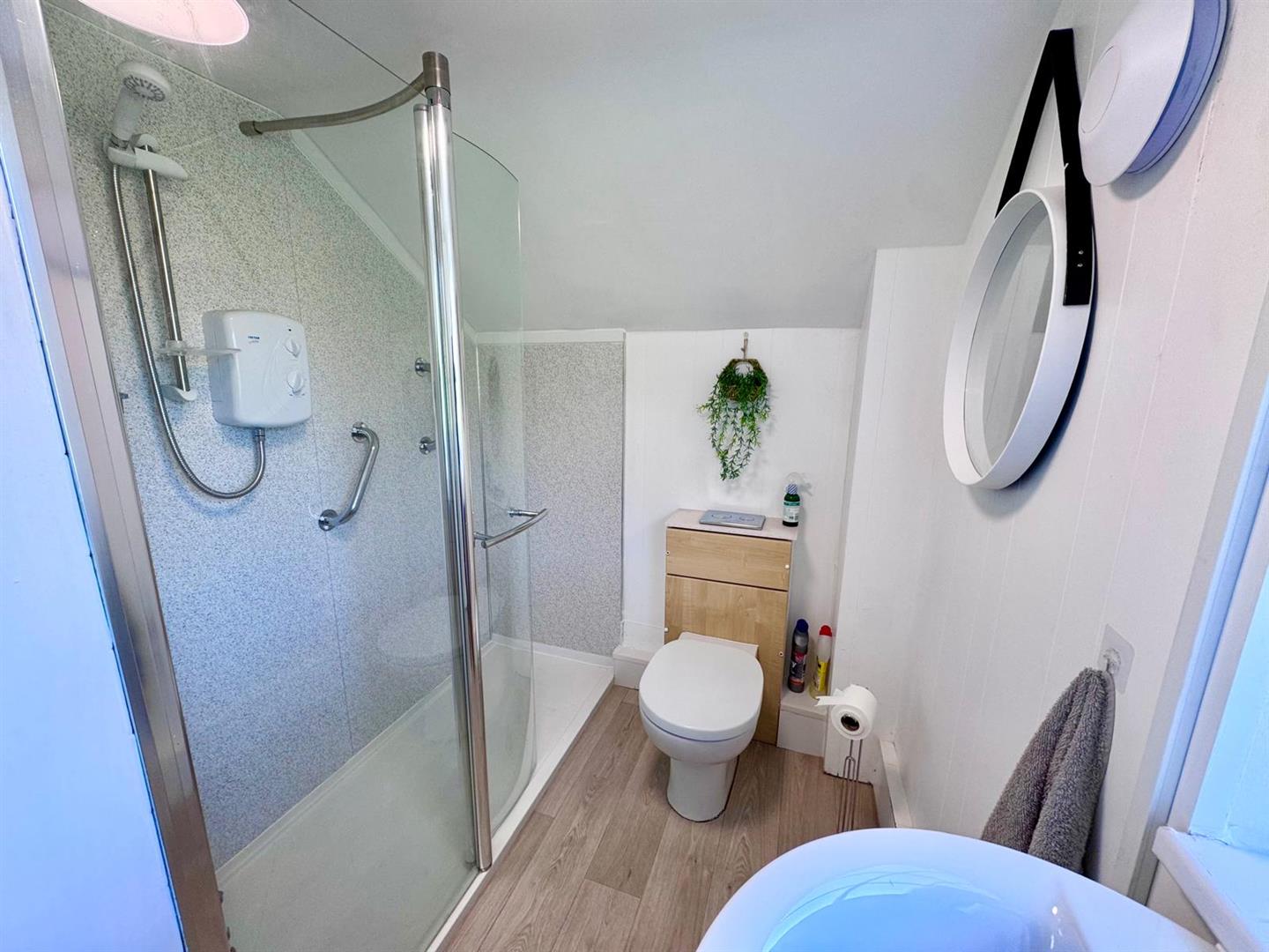 Large shower enclosure, electric shower, low level WC, pedestal wash hand basin, double glazed window overlooking side of property.
