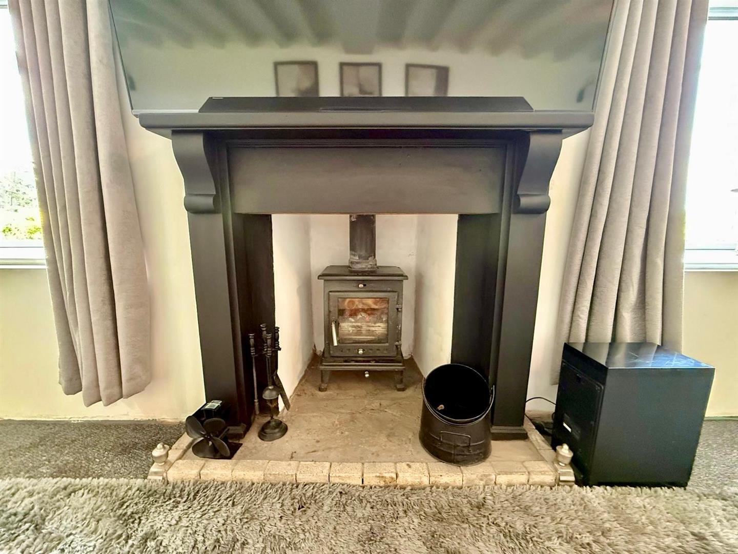 Feature fireplace surround, two uPVC double glazed picture windows overlooking front of property enjoying views over the valley towards the mountains, feature recessed fireplace with log burning stove and radiators, beamed ceiling. Steps leading up to: