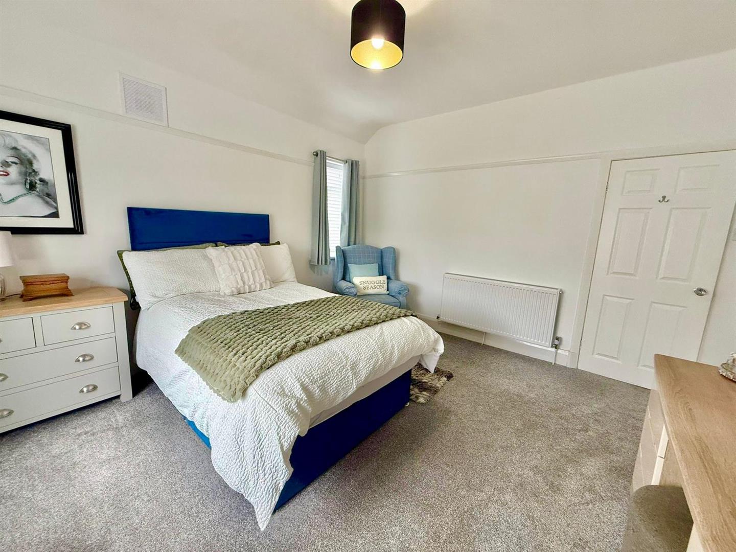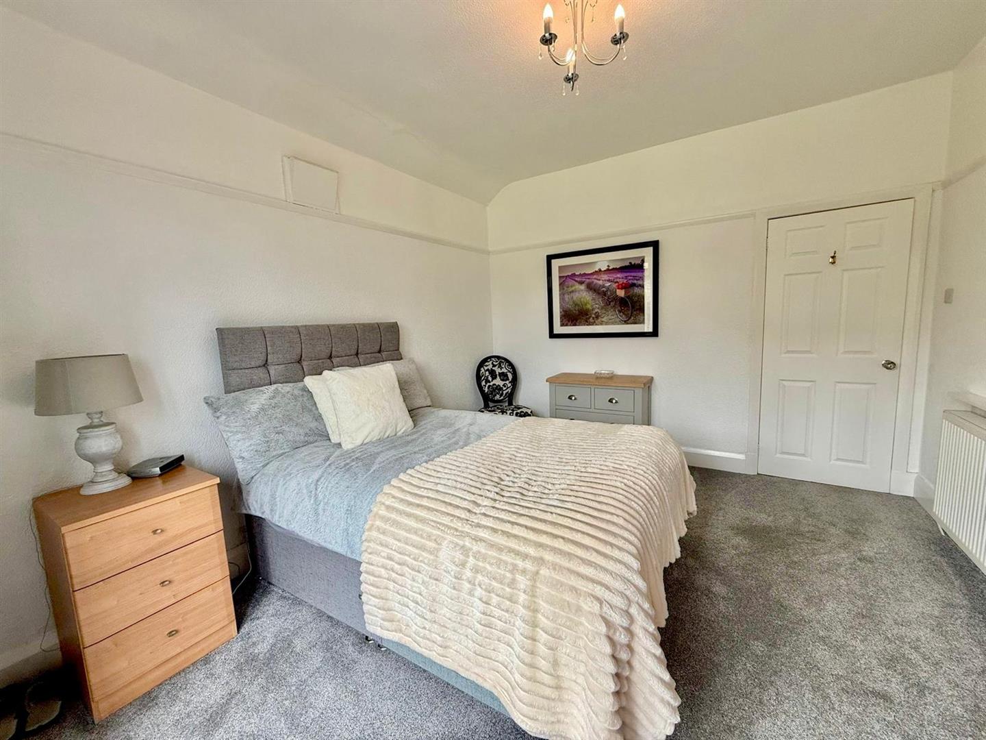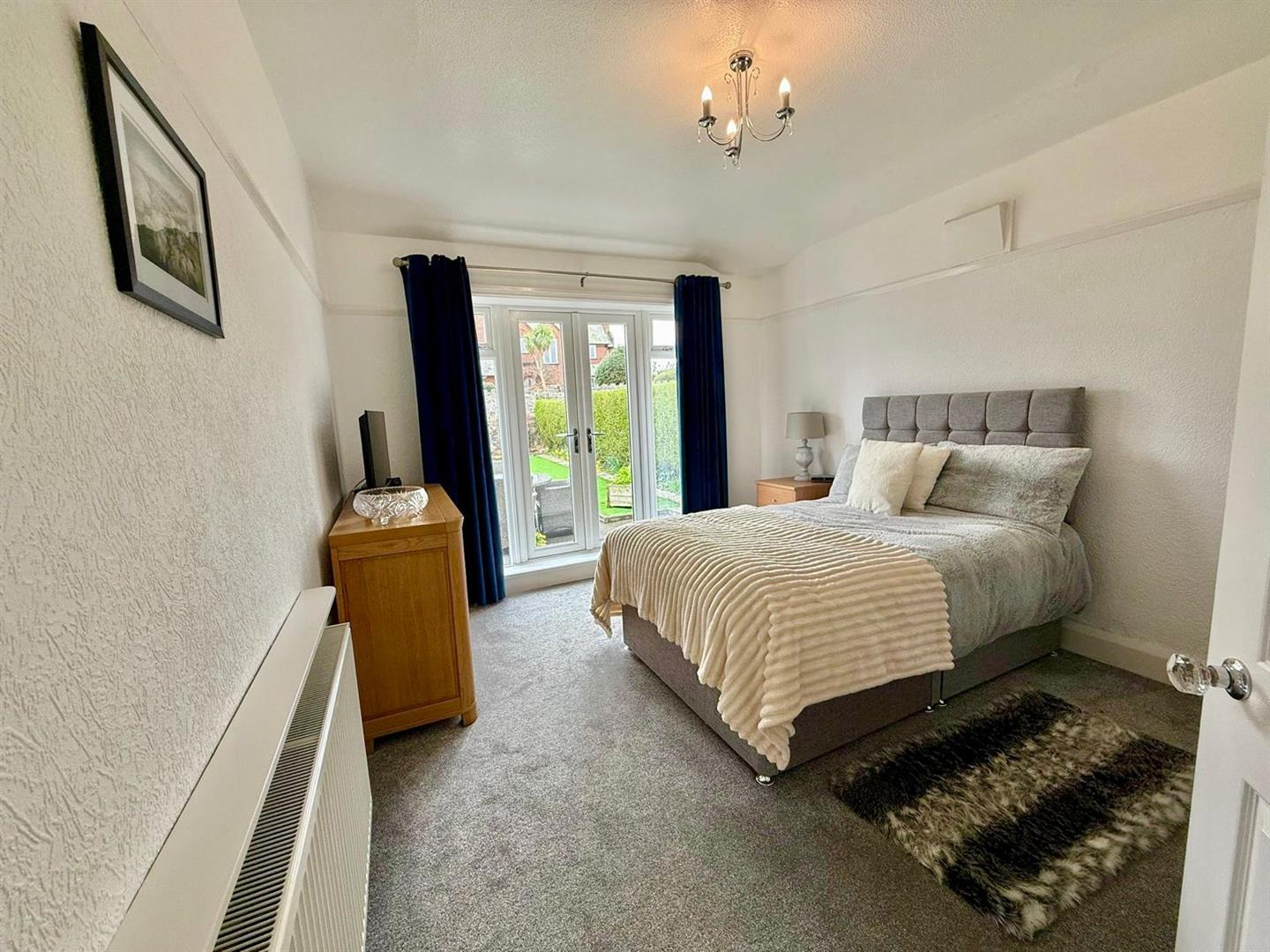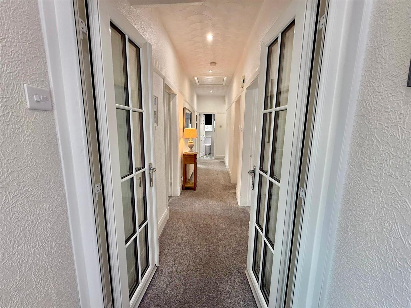 Cupboard housing electrics; UPVC double glazed window; inset spotlighting; UPVC double doors leading to hallway; radiator; picture rail; access to loft.
