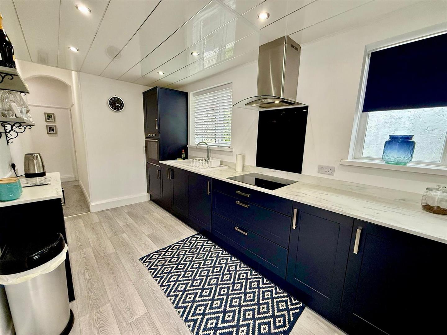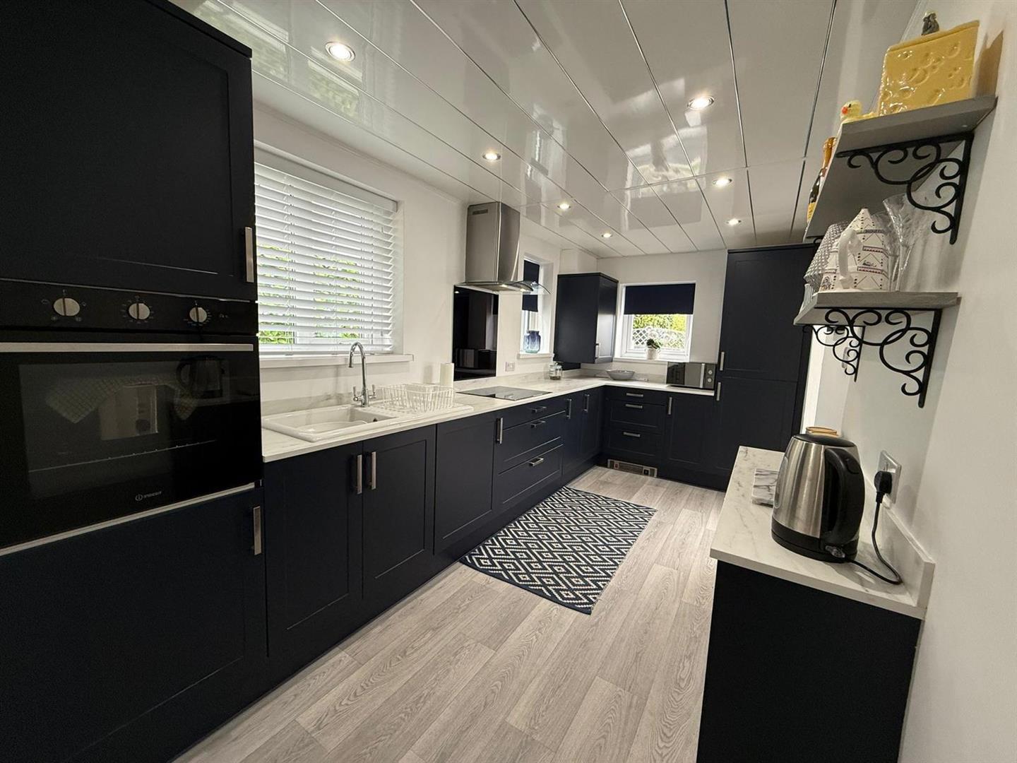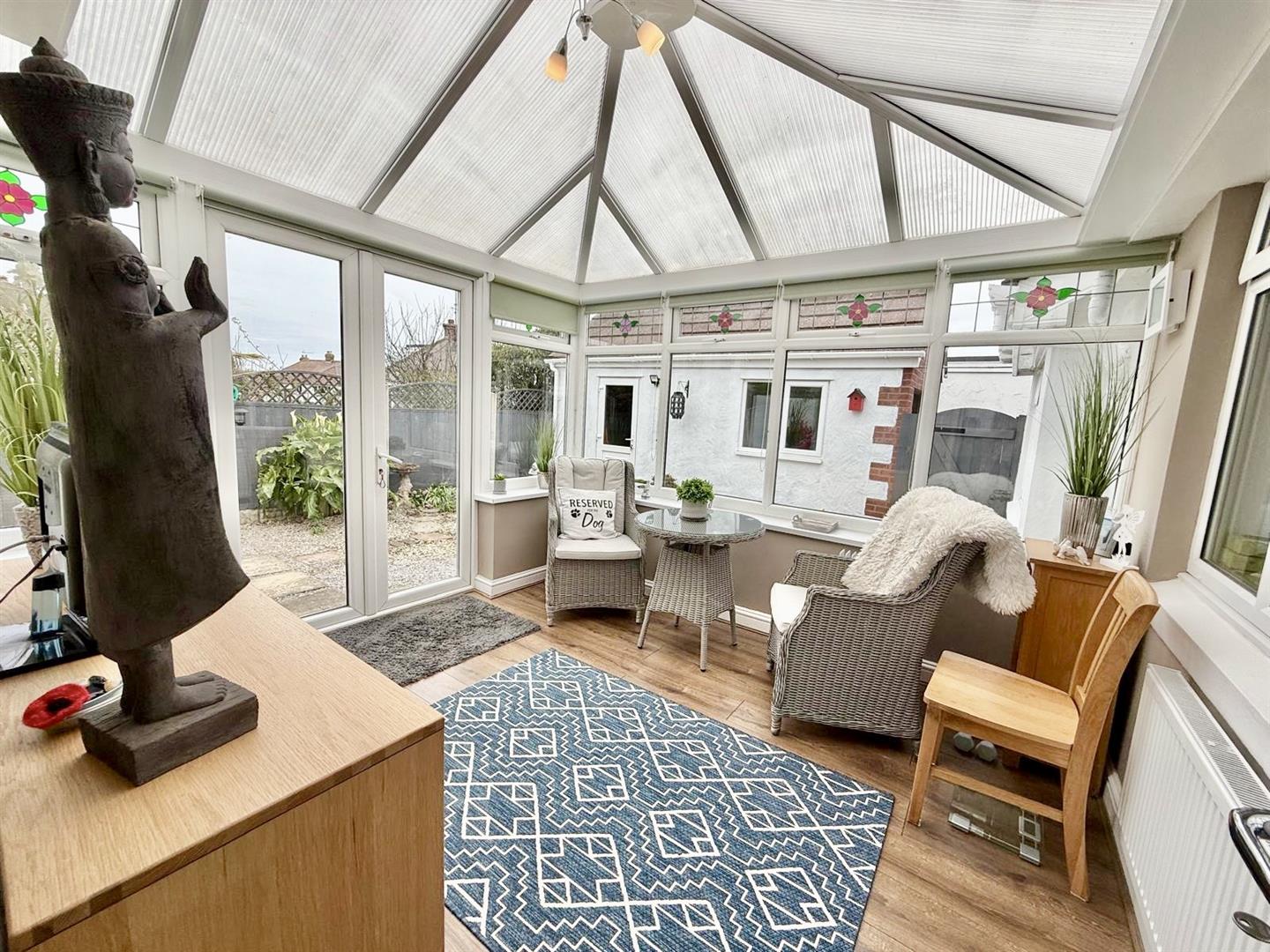 Range of base and wall units with complementary worktop over; eye level electric oven; four ring induction hob; integrated fridge freezer; 3 UPVC double glazed windows; cupboard housing Worcester central heating boiler; inset spotlighting; radiator; wood effect flooring; UPVC panel door leading to conservatory.