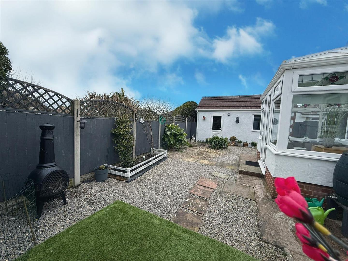 To the outside the front garden is laid to no maintenance artificial lawn with ample parking leading to a detached garage. To the rear there is also a low maintenance enclosed garden.